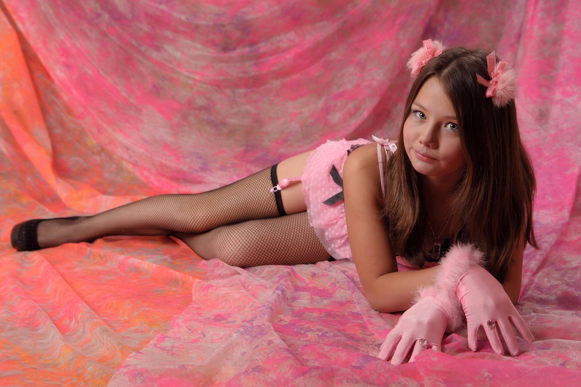 Pink view, a teenager lies with her legs straightened in heels in underwear and stockings