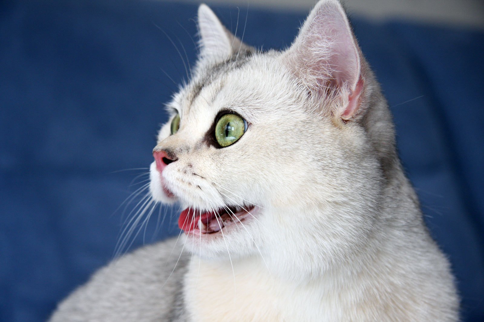 The green-eyed kote smiles at the hostess