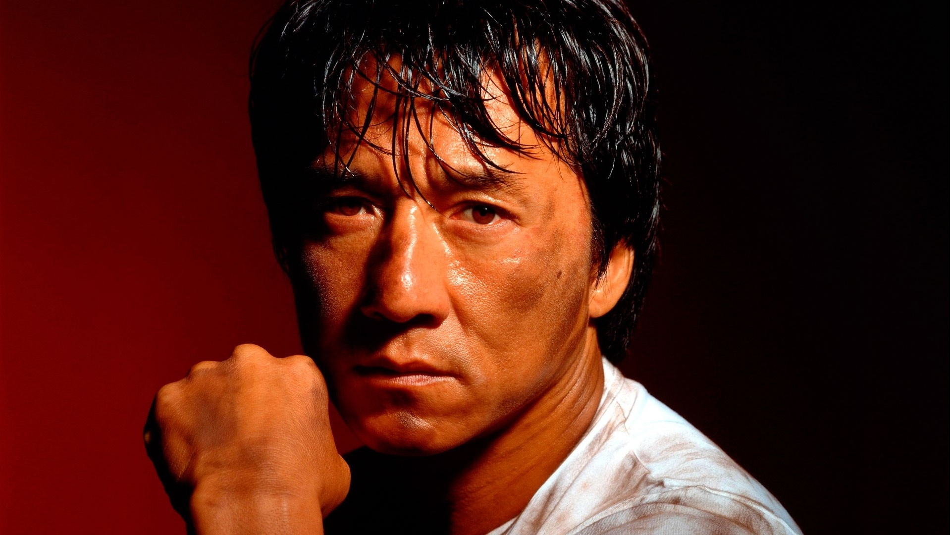 Jackie Chan sits with a fist in his hand