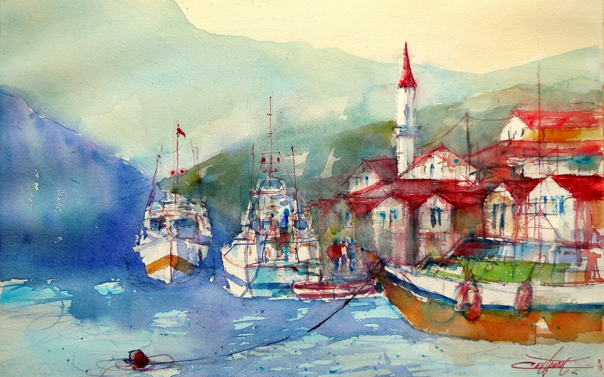 Ships near the shore of the lake watercolor drawing