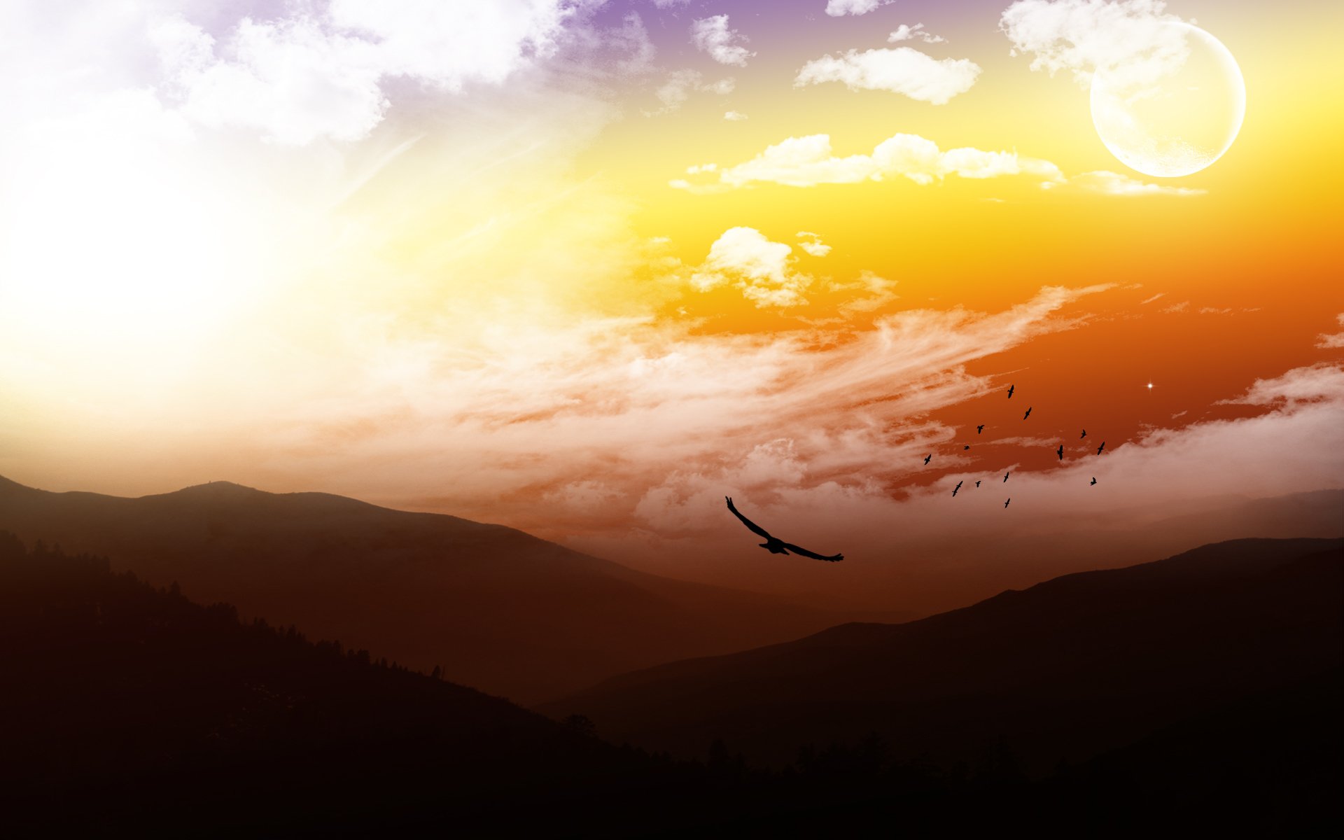 Image tags:landscapes, mountains, birds, heaven, sky, clouds, moon, luna, gorgeous landscape, bombovsky form, super- duper quality, mountain, view