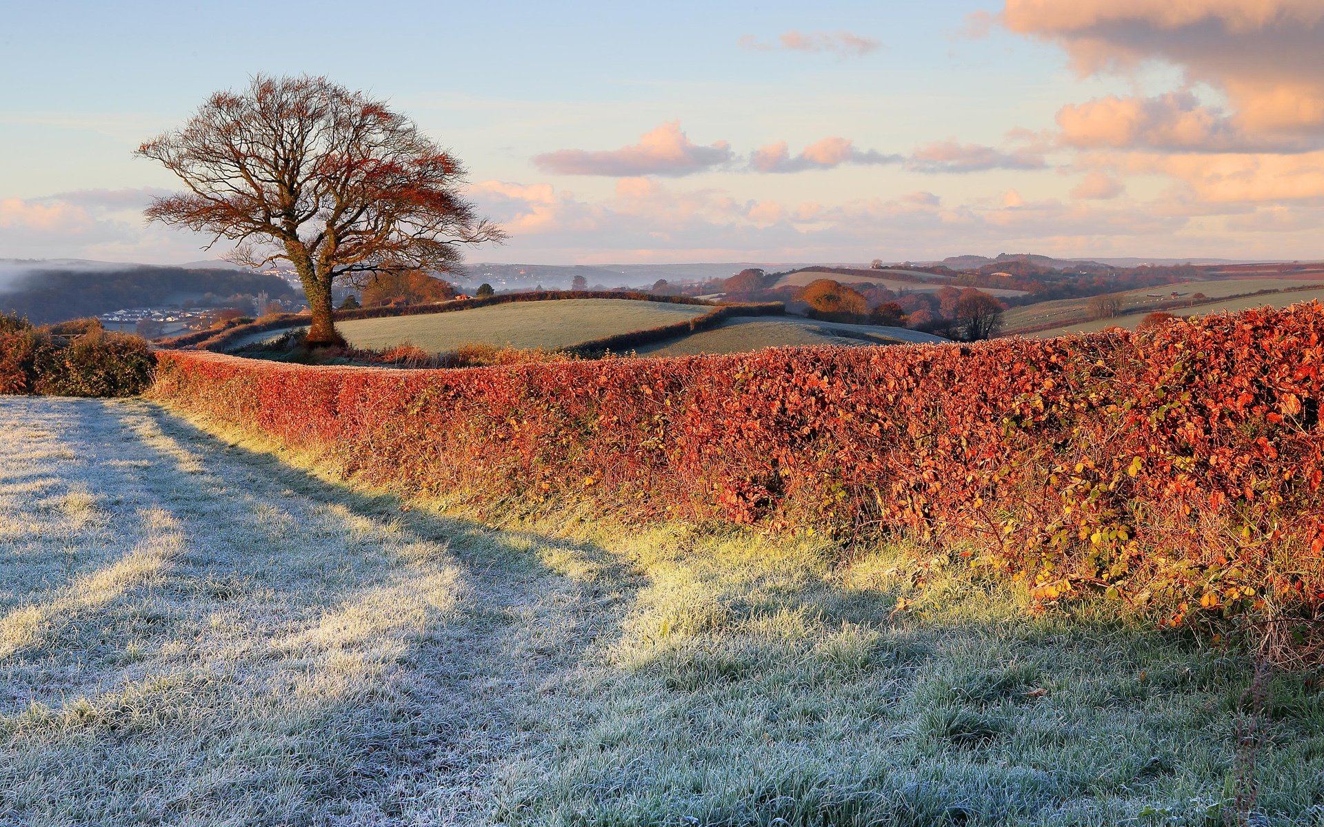 Fields covered with frost with a tree standing alone