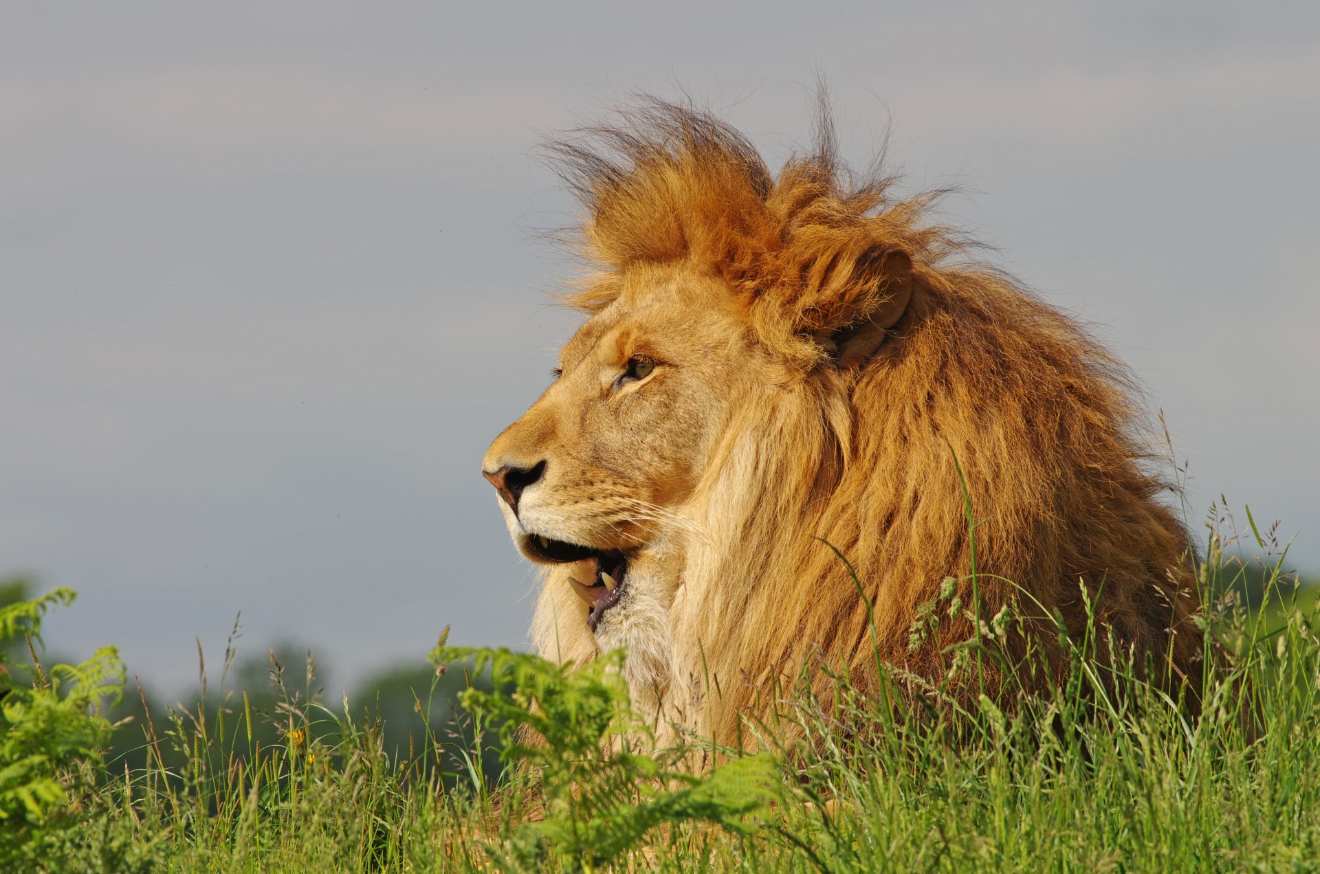 A lion with a mane lies in the grass