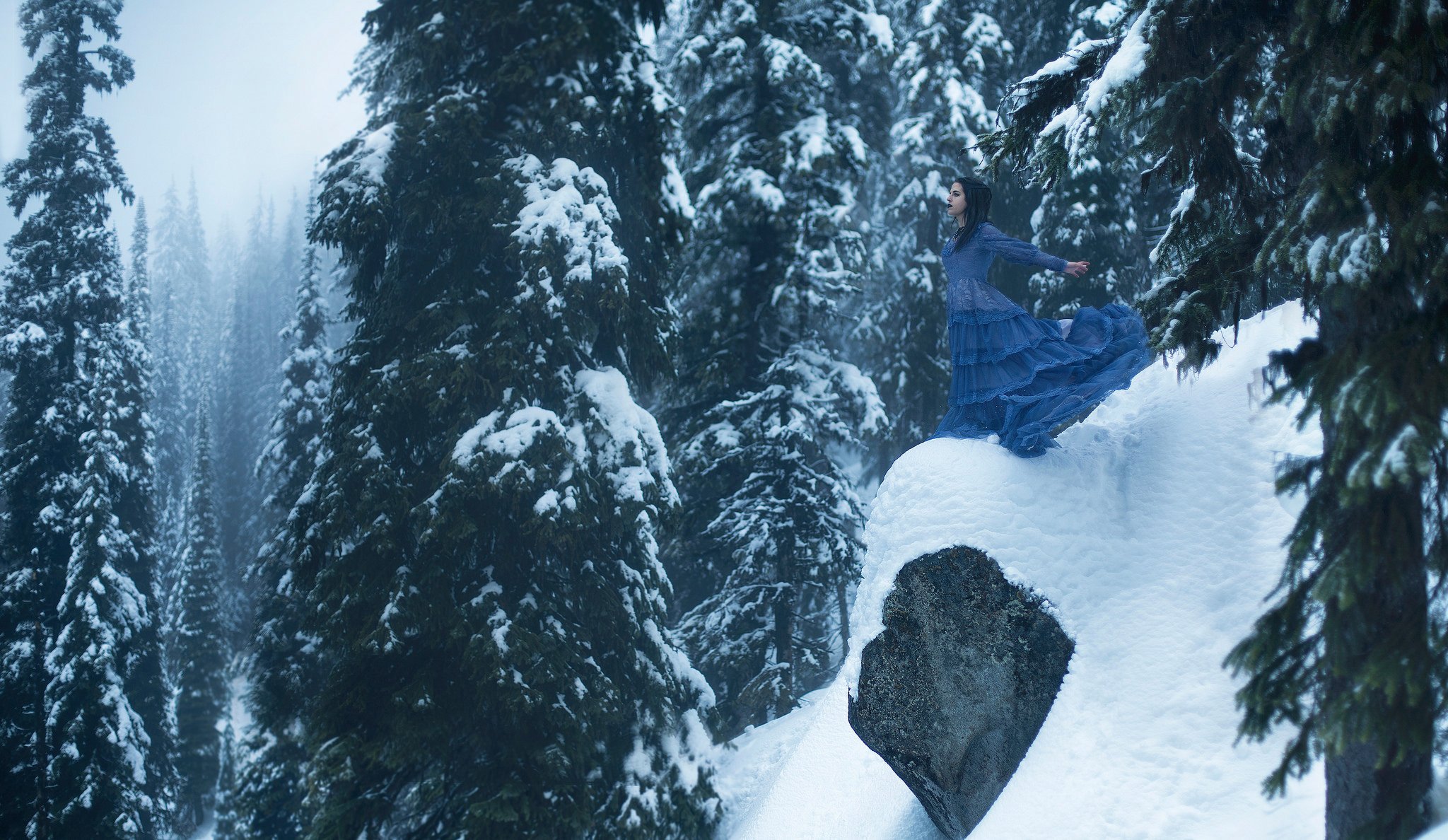 Girl on the background of fir trees in the snow