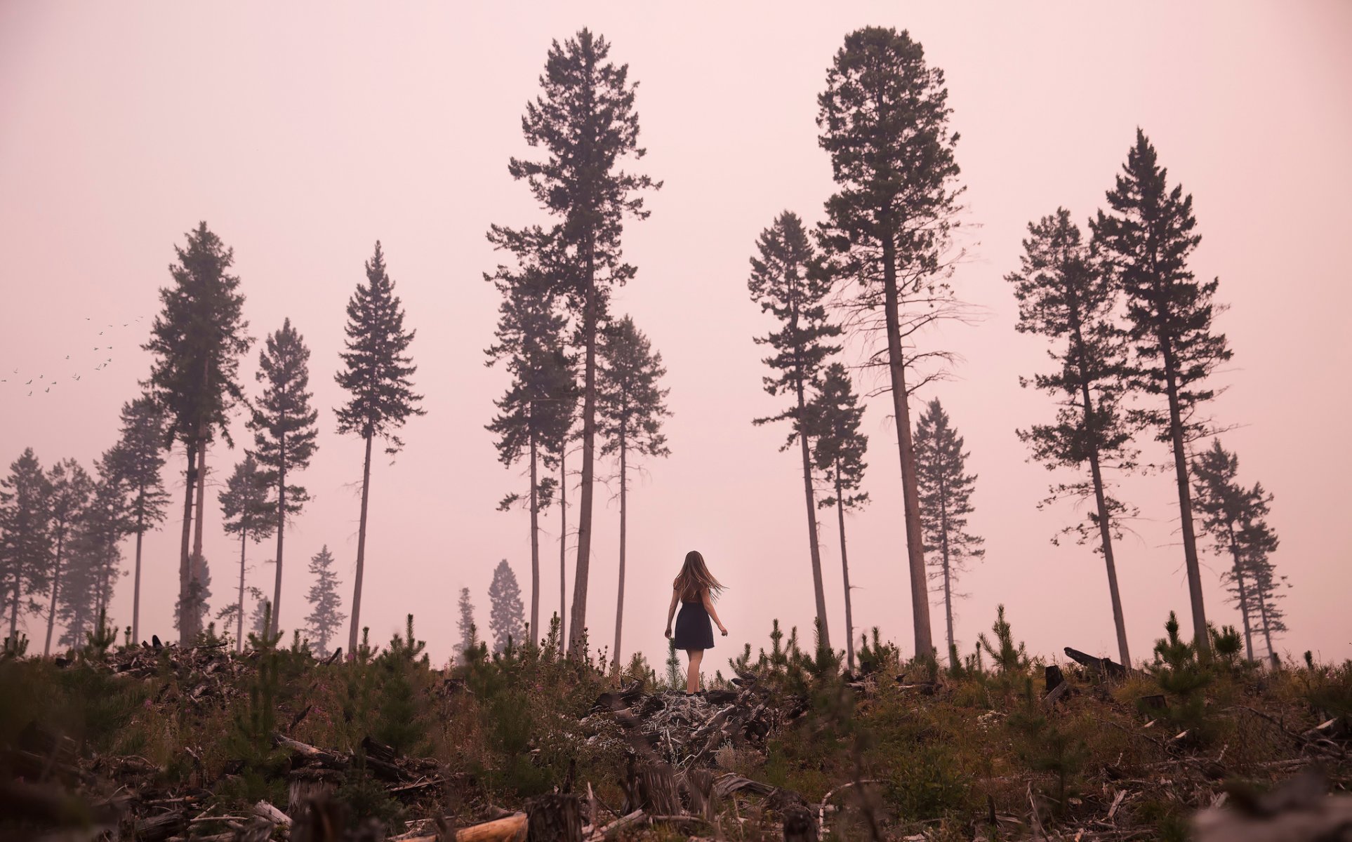 The girl is standing in the middle of the forest