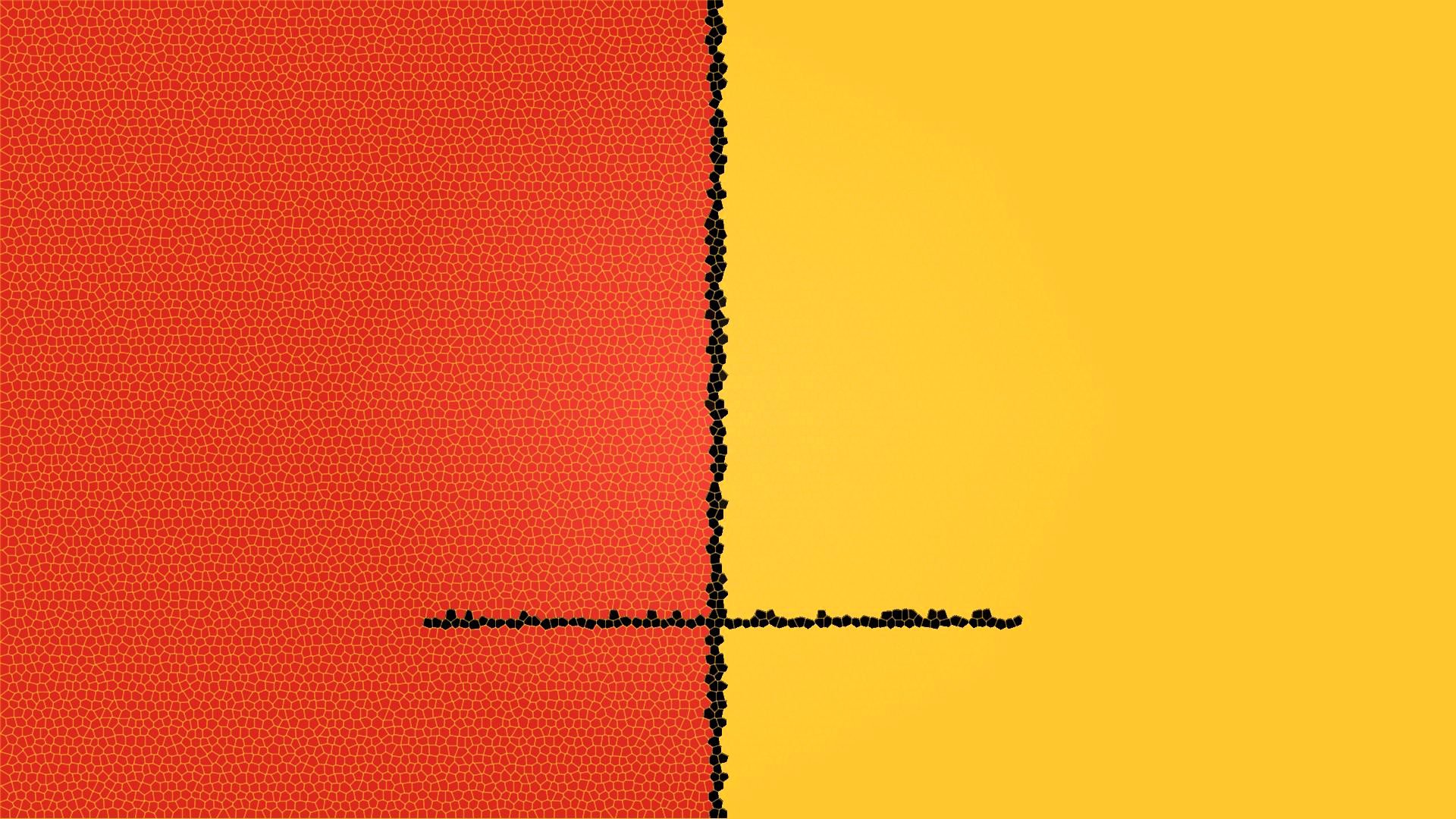Intersecting yellow and orange colors separated by a black stripe of cells
