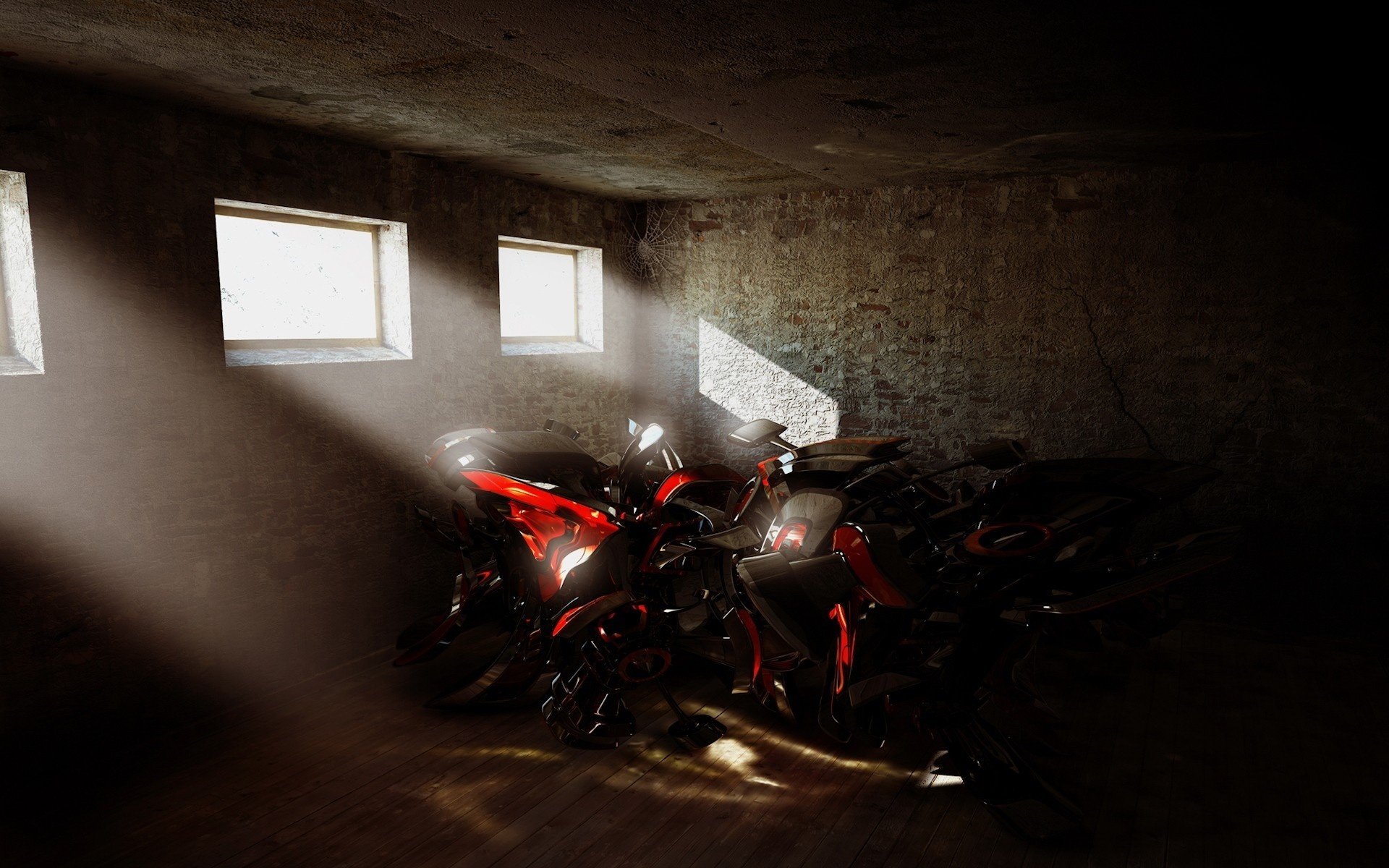 Image tags:robot in the corner, windows, the building, light, darkness, the rays of the sun