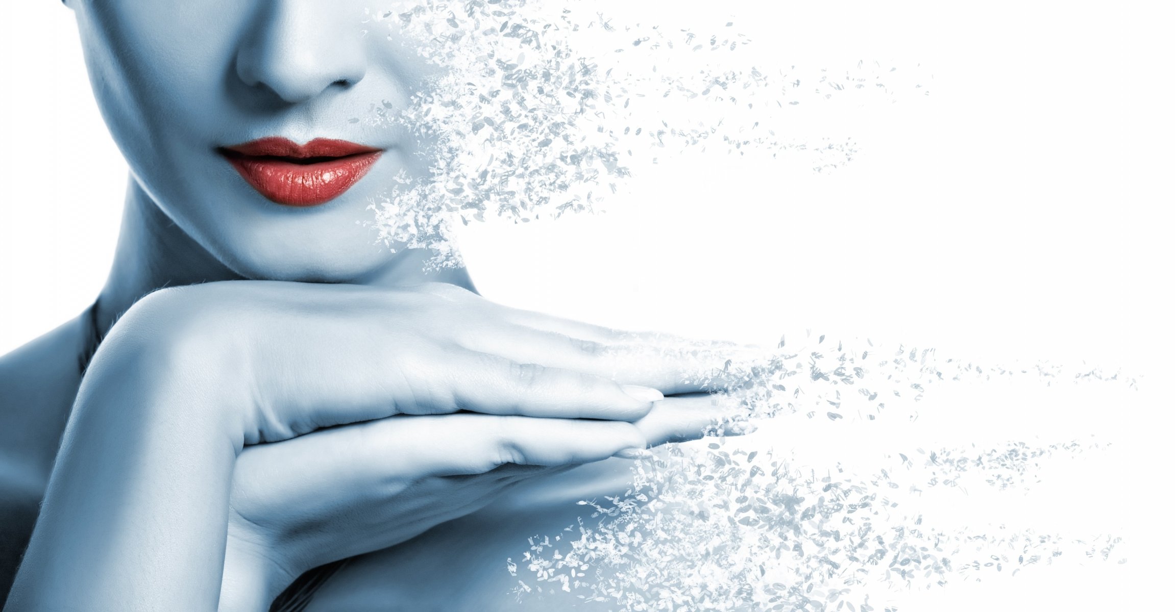 Red lips of a woman and hands near her face