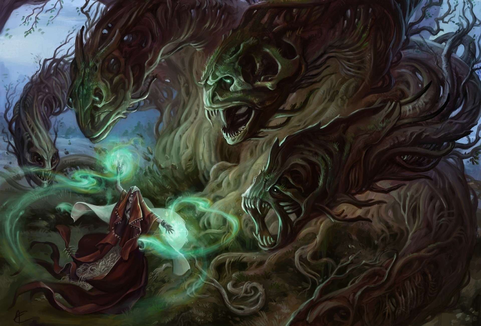 Girl magician adorns green snakes
