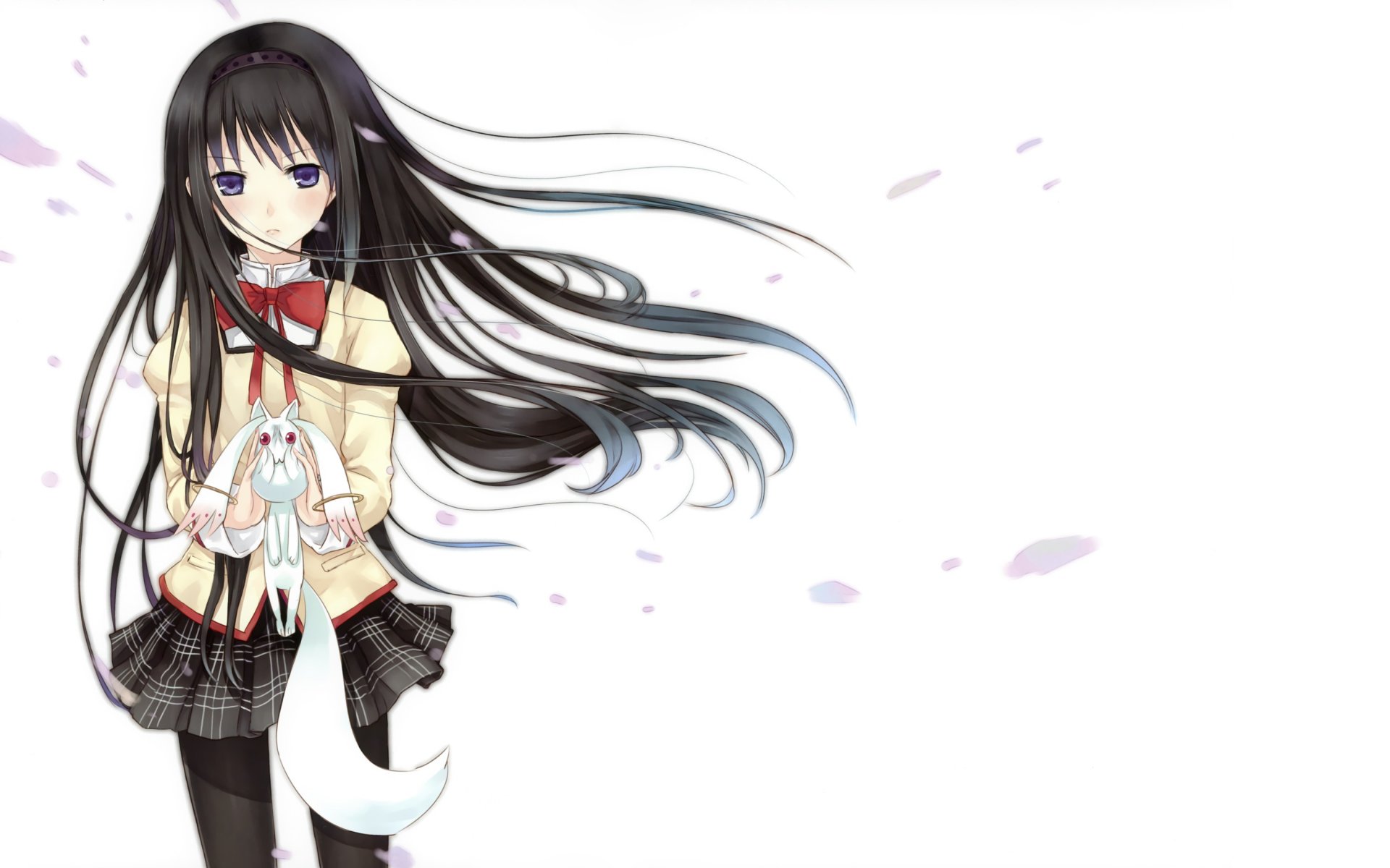 Image tags:mahou shoujo madoka magica, akemi homura, kazuharu kina, kyubey, anime, girl, white background, petals, long hair, skirt, purple eyes