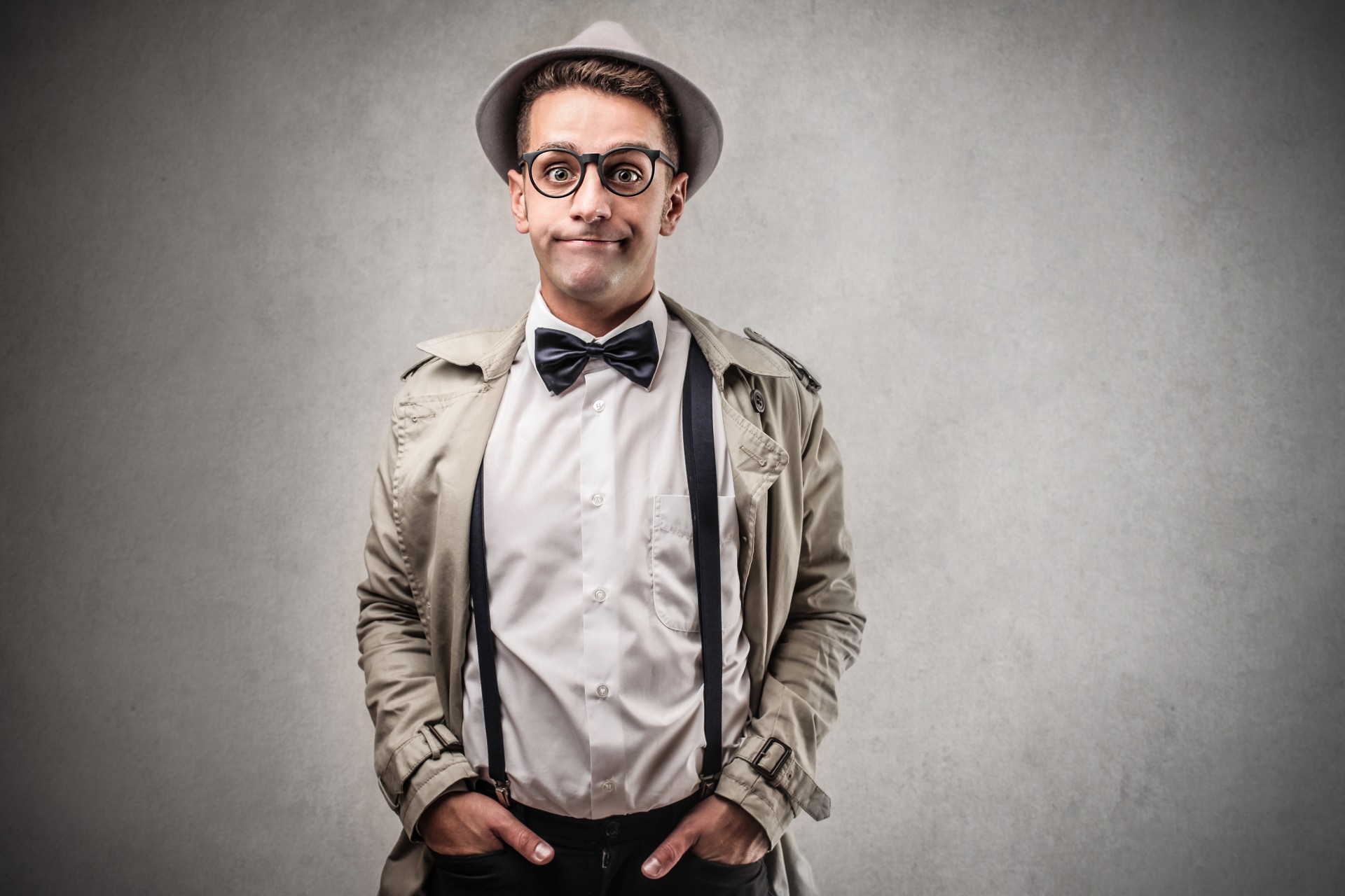 A man in suspenders, a hat, glasses and a coat is standing near a gray wall