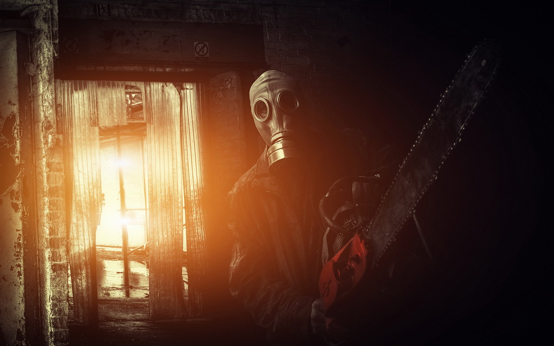 A man on fire in a gas mask with a chainsaw