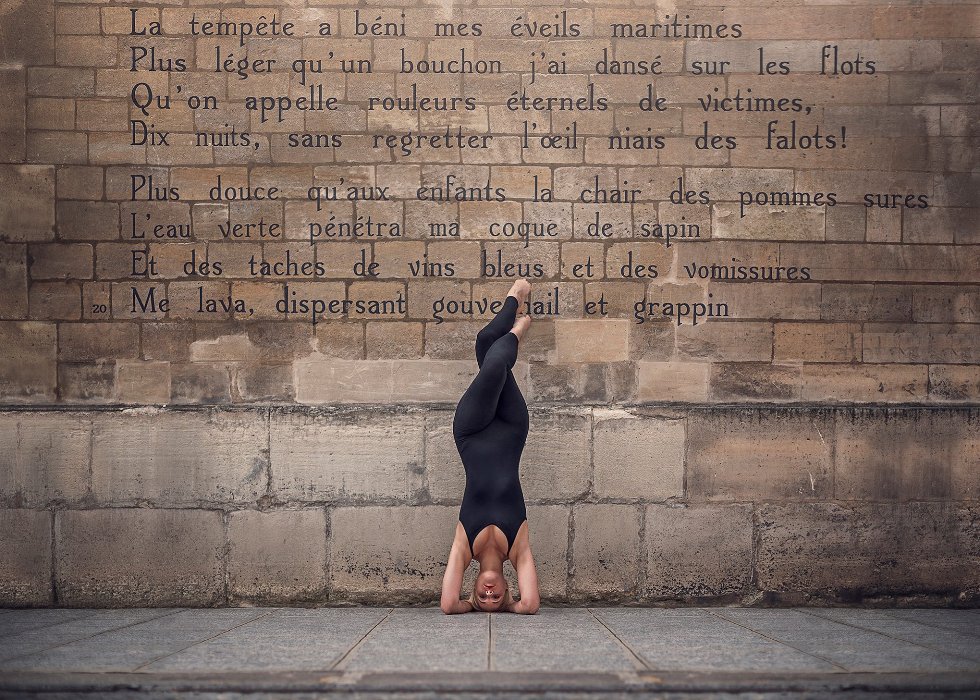 A ballerina in a pose against a wall with poems