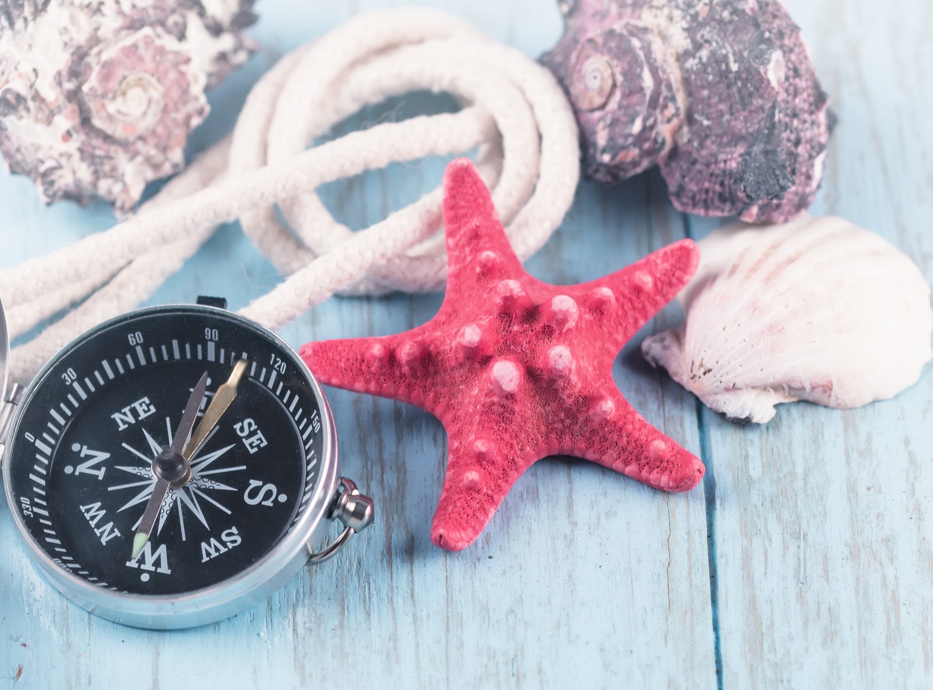The sea on a wooden board. compass. seashells. starfish