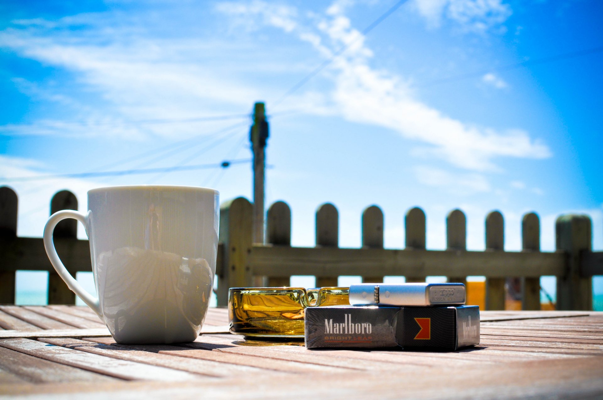 Cup, ashtray, lighter and cigarettes against a blue sky background