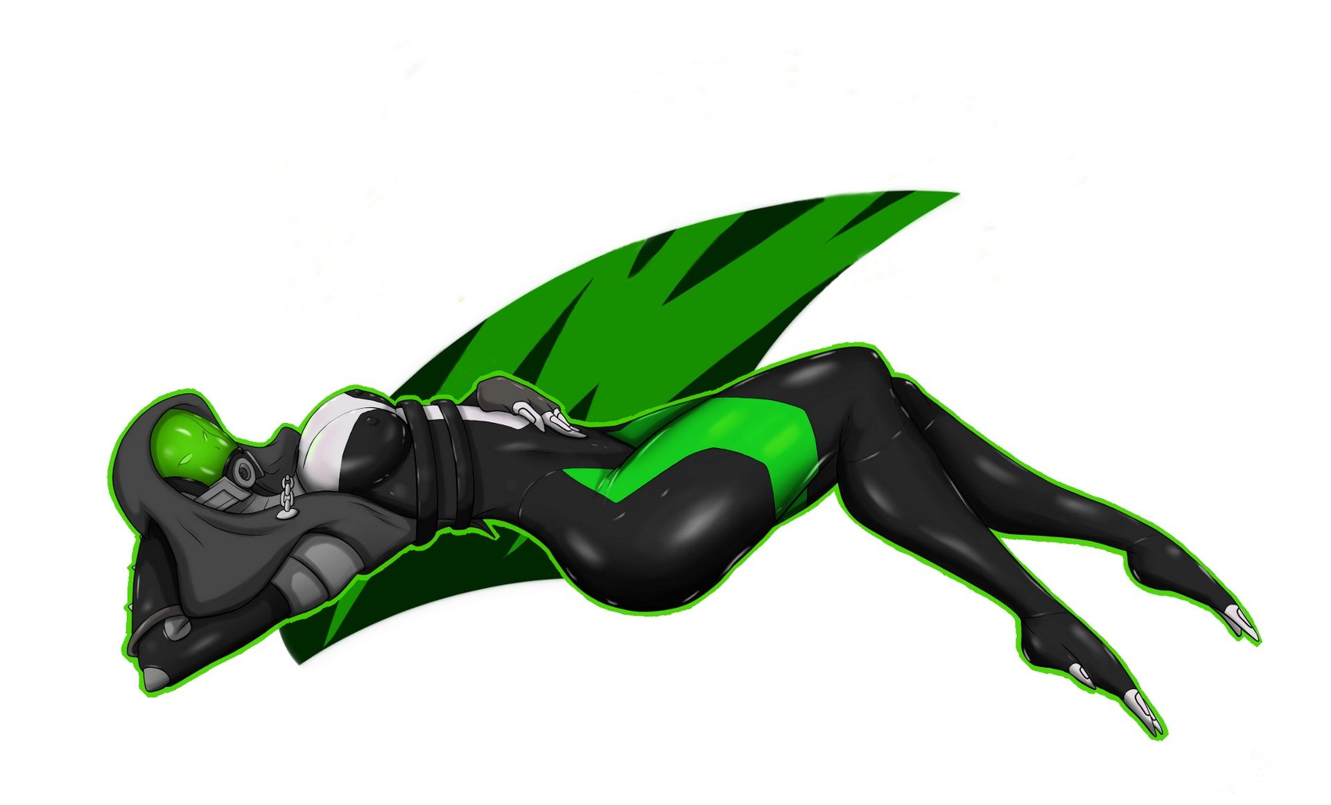 A Quarian in a green suit and helmet from mass effect