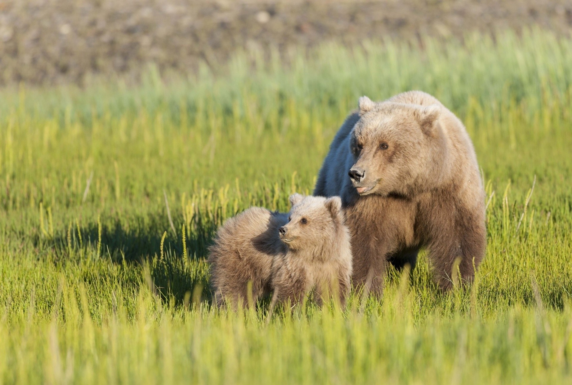 A bear with a bear cub walking in a meadow