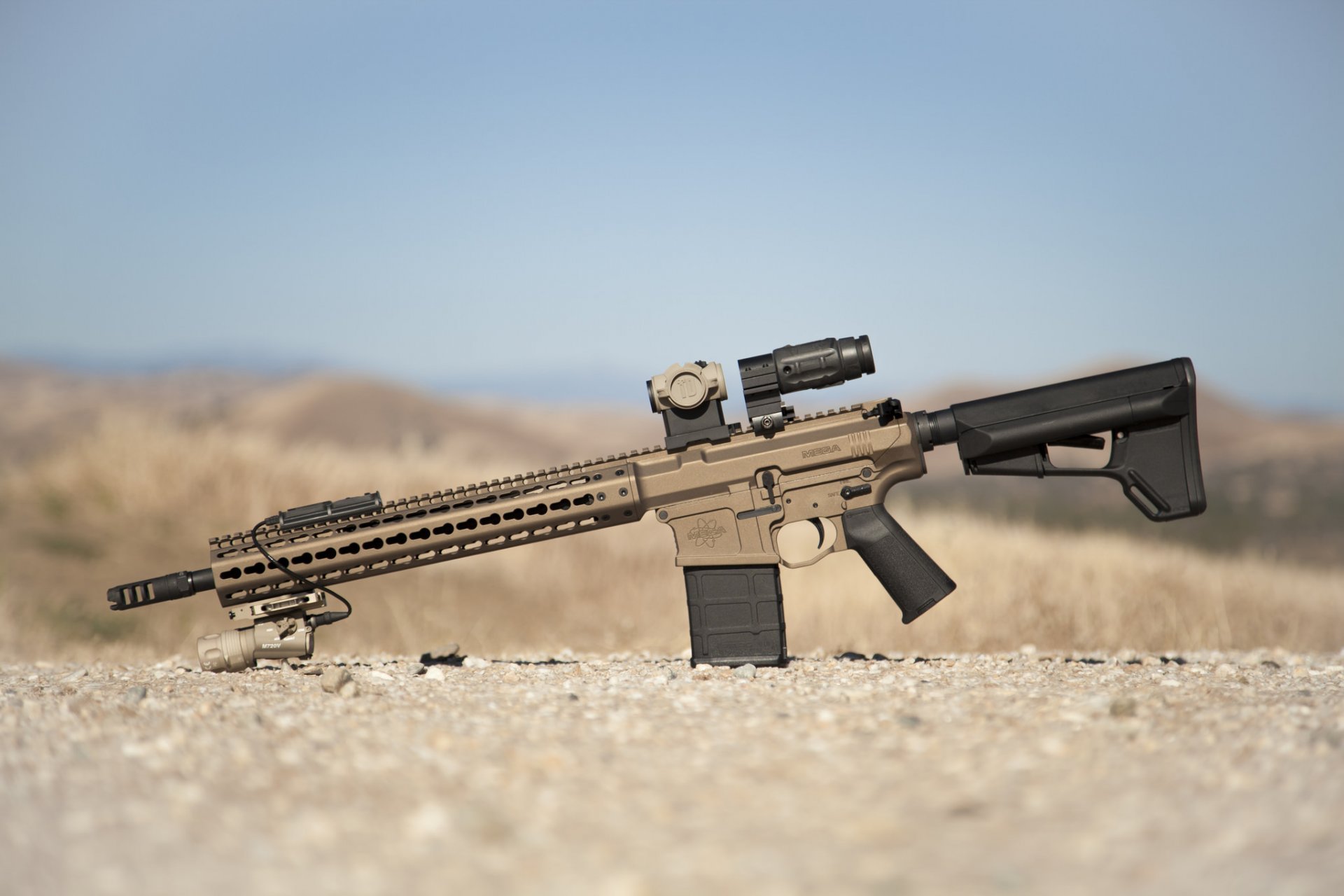 An assault rifle against the background of hills stretching away into the distance