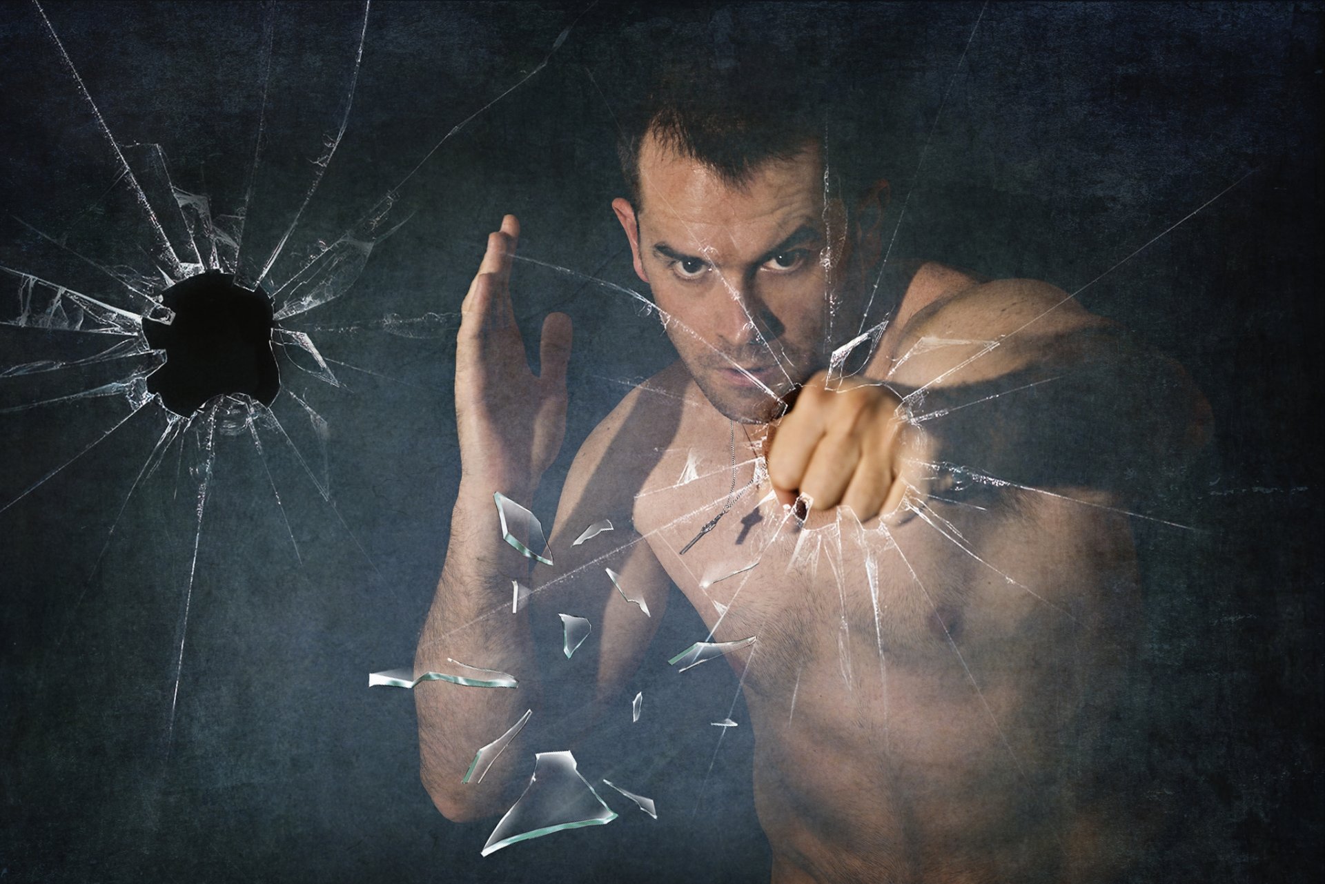 The guy breaks the glass with his fists
