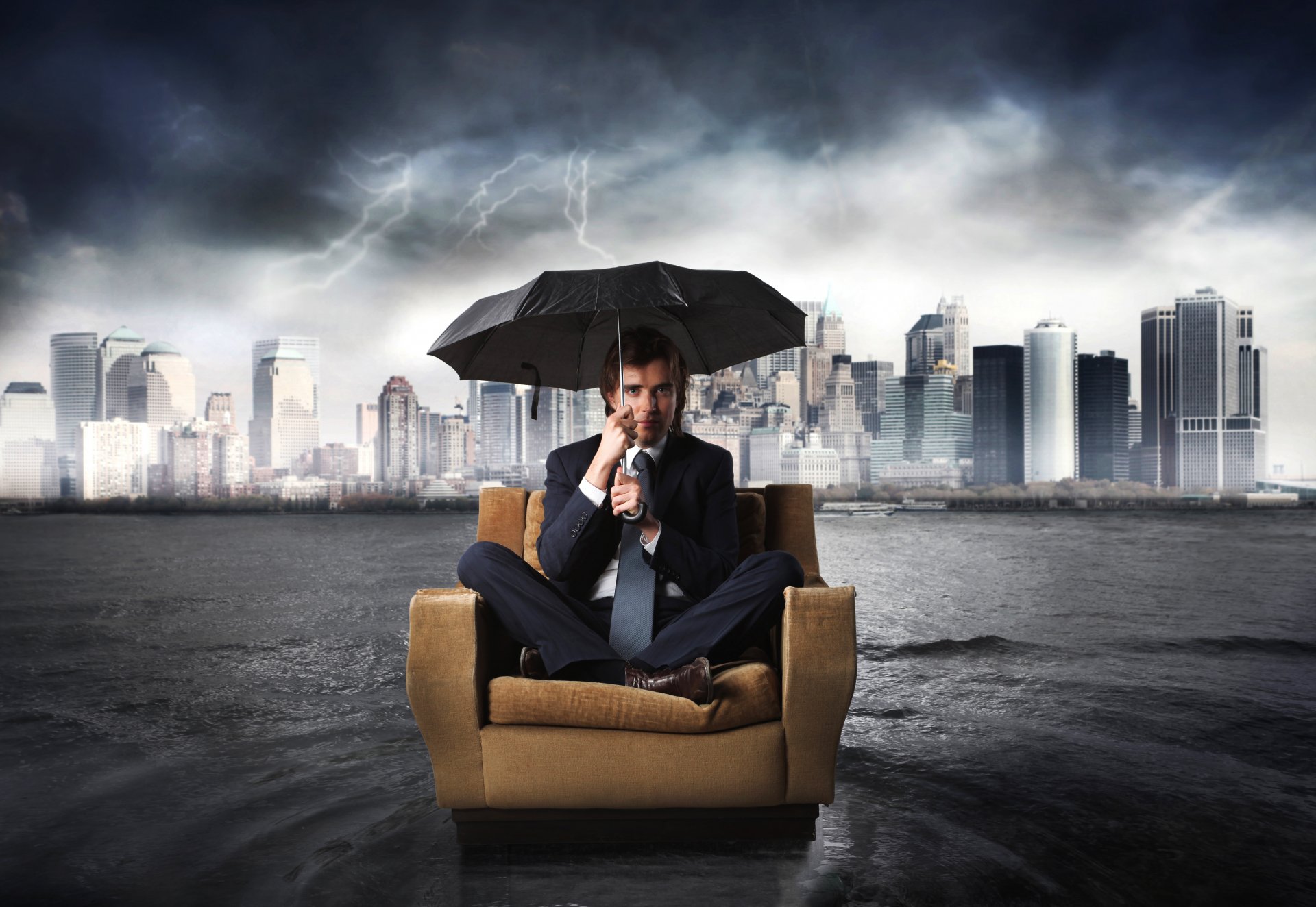 A man in a suit sitting under an umbrella in a chair