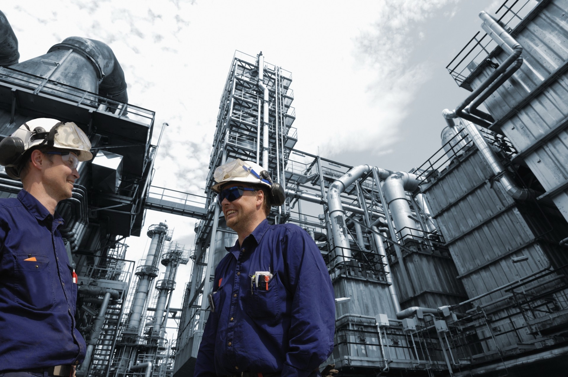 Engineers at work. Men in uniform on the background of an industrial building