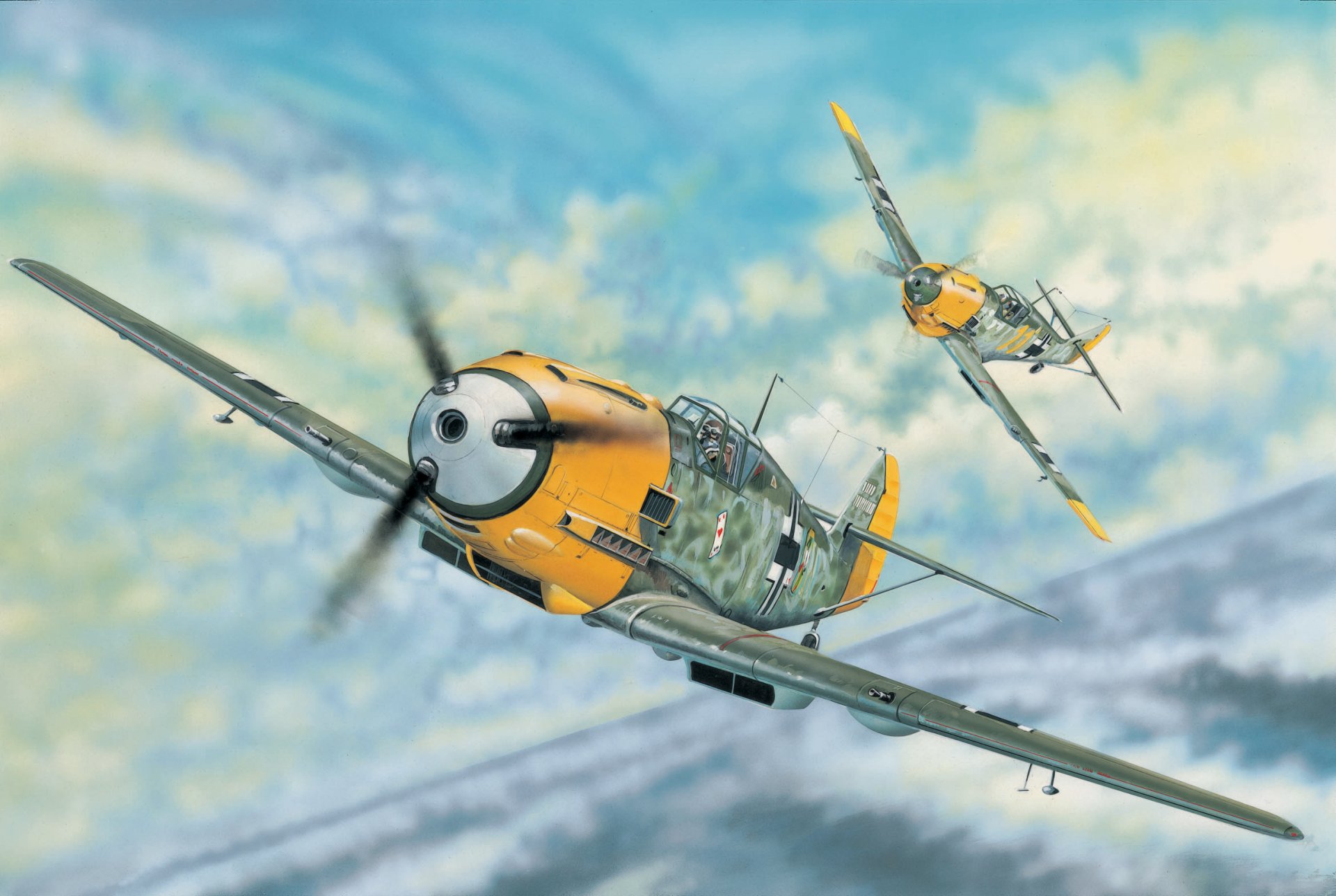 Scenic flight of two orange-green "Mmesserschmitt B 109E-3" during WW2.