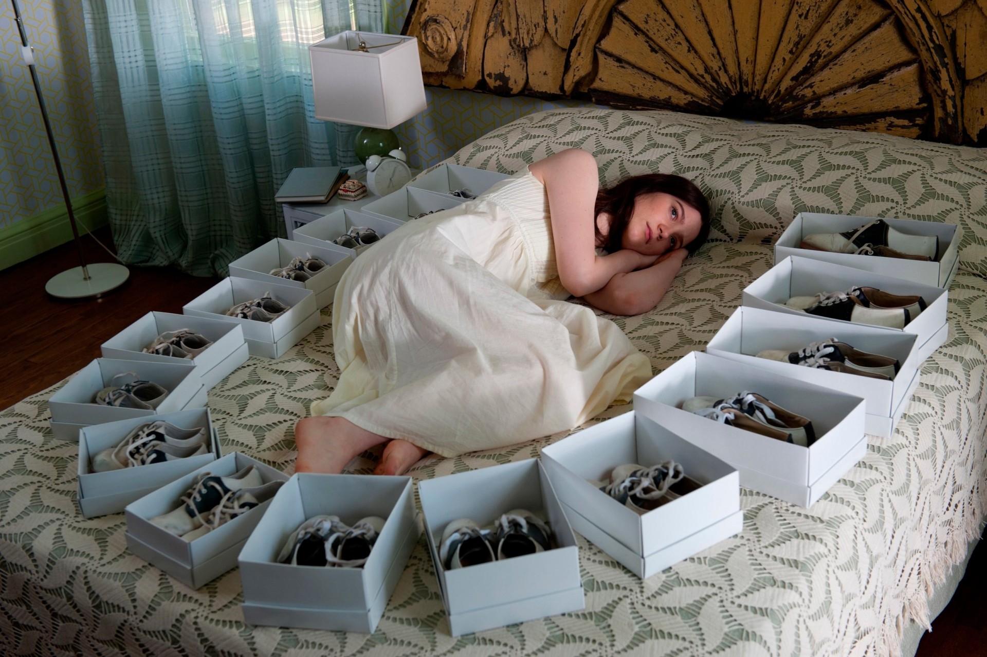 A beautiful girl is lying on a bed with a lot of boxes with shoes