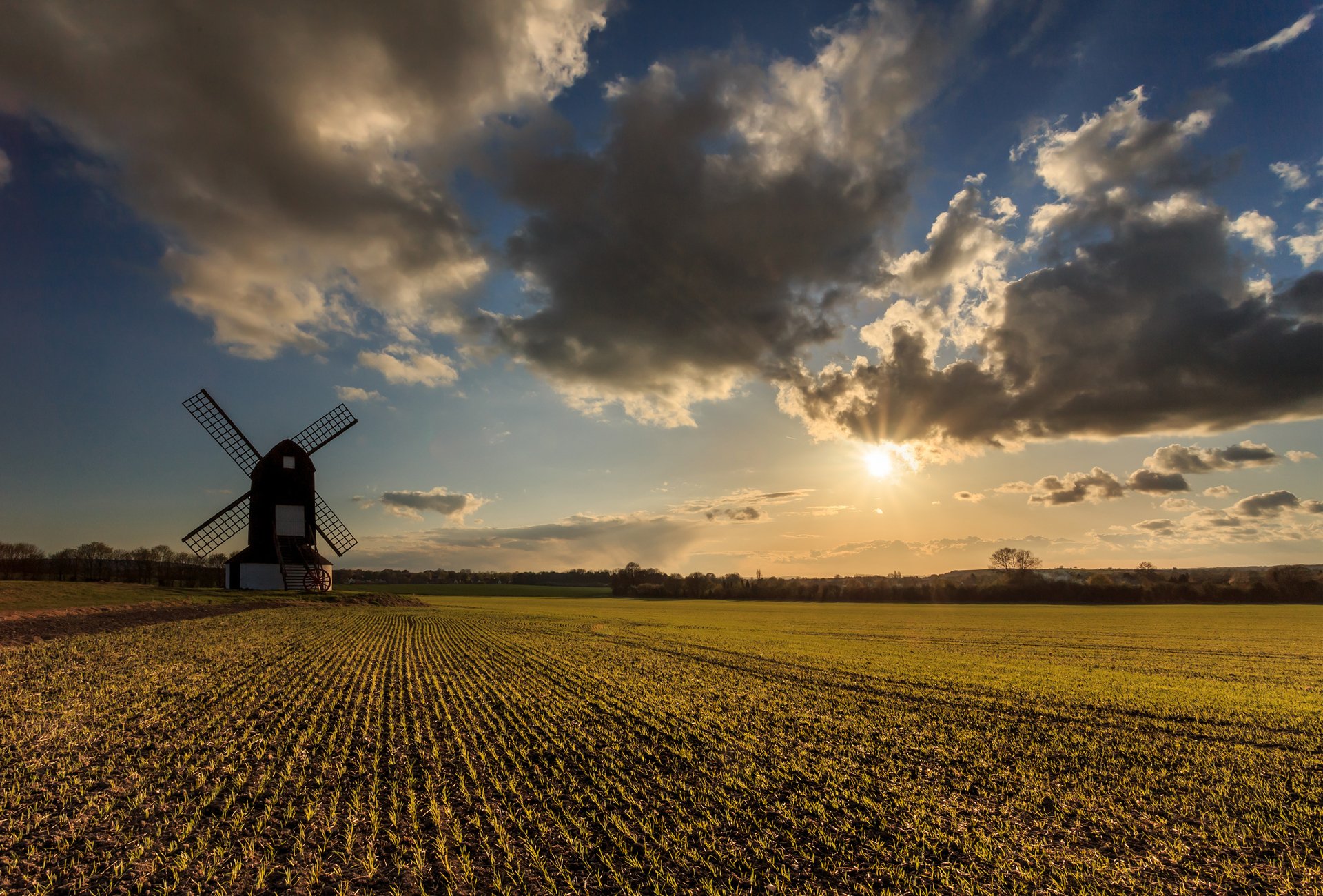 A mill in a vast field is illuminated by the sun breaking through thick clouds