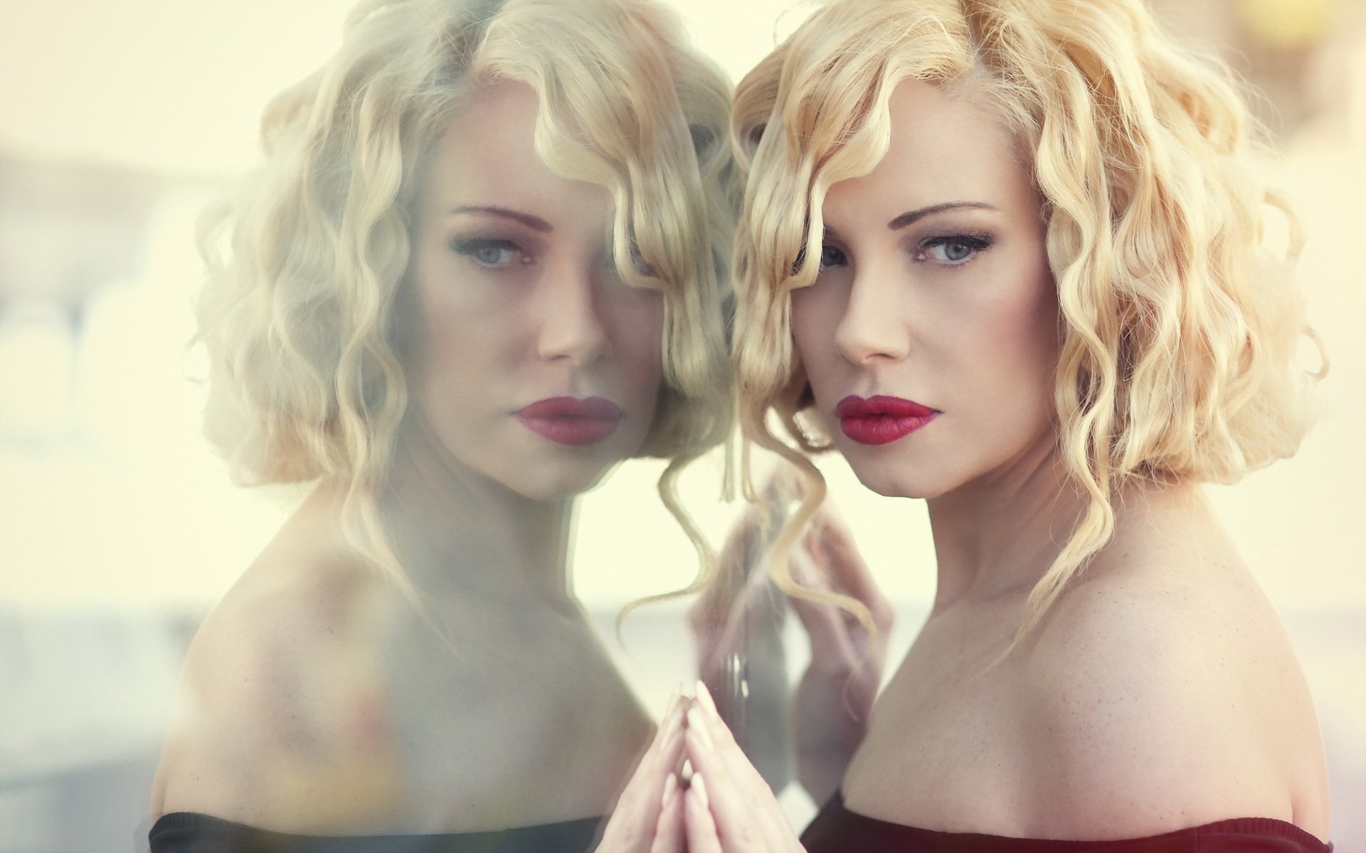 Reflection of a blonde with red lips