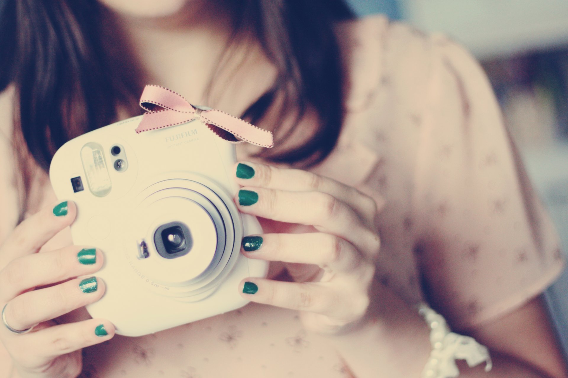 Image tags:mood, girl, brunette, a camera, photo, bow, pink, lacquer, green, nails, background, wallpaper