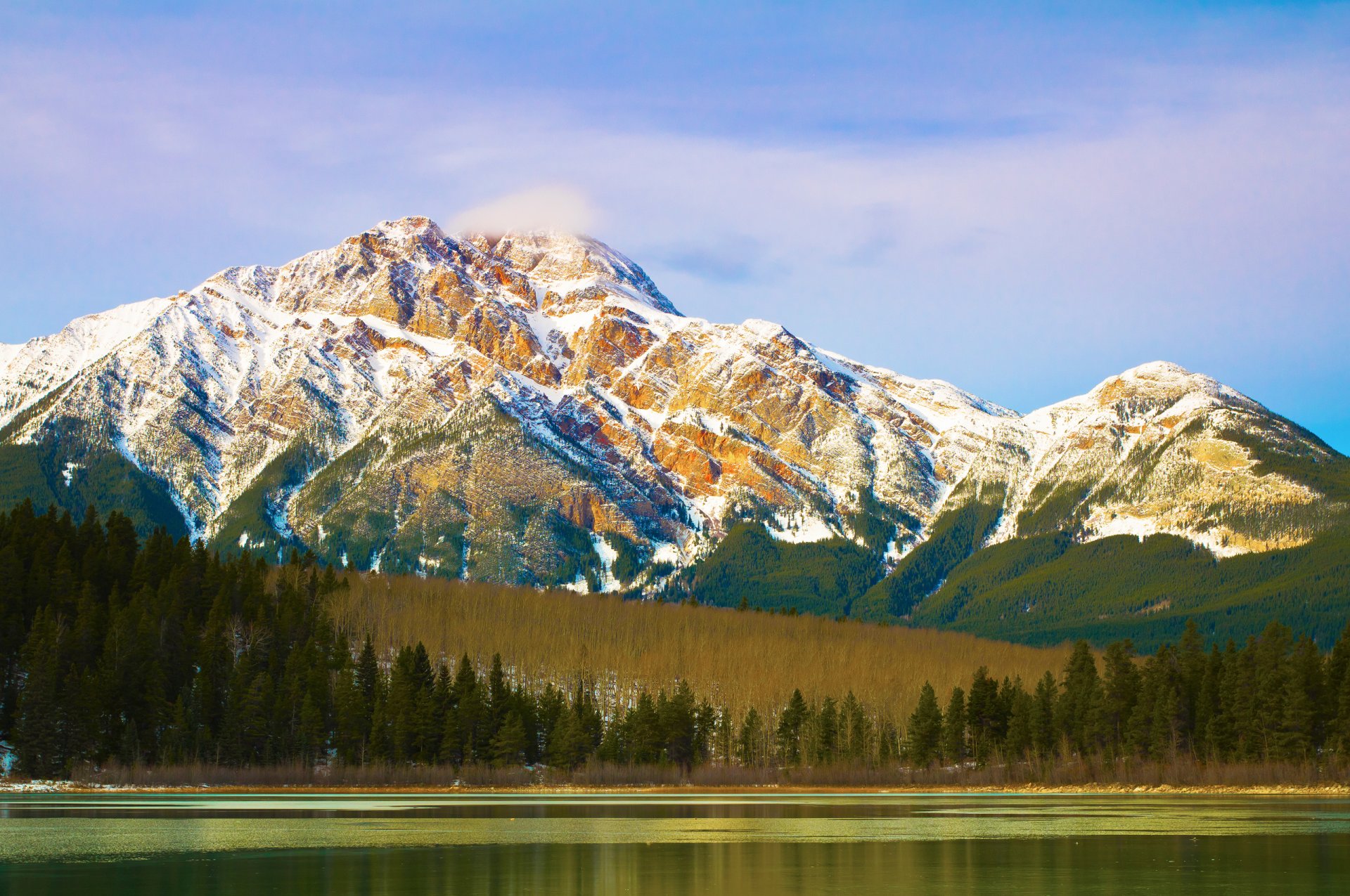 Beautiful mountains and forest are reflected in the quiet river