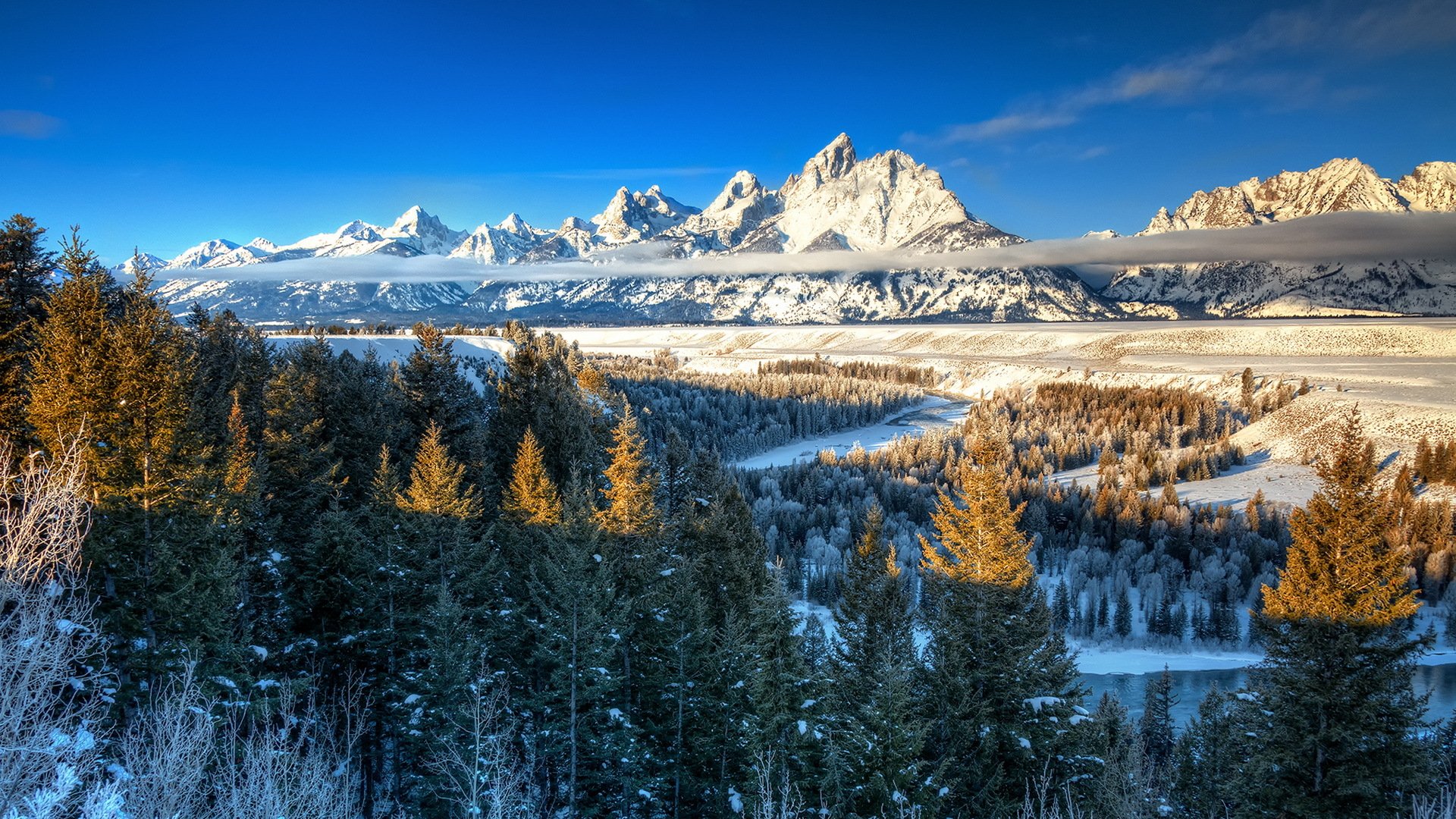 Fantastic snowy mountain peaks and forest