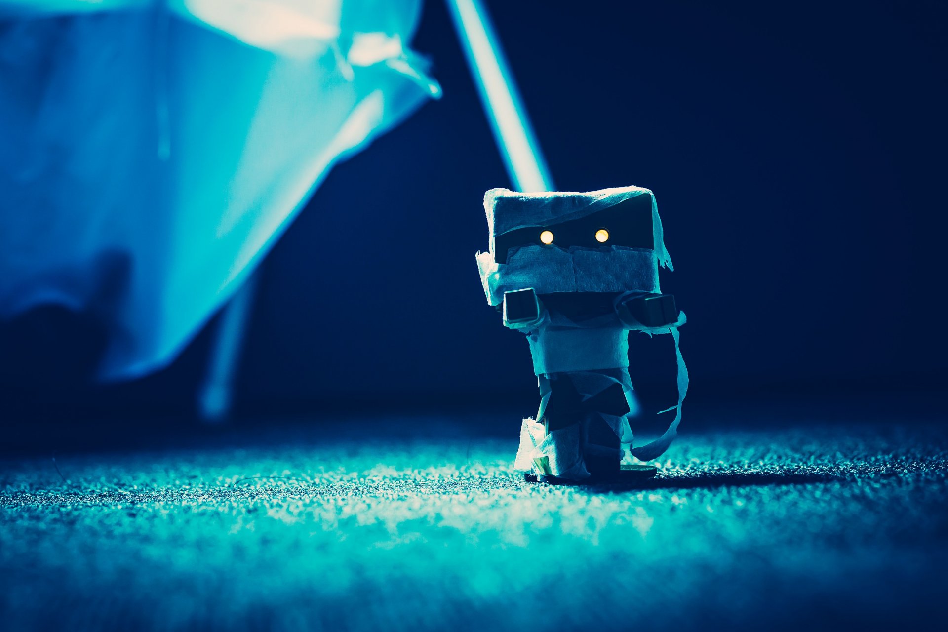 Image tags:mummy, monster, blue, bandages, light eyes, minimalism, background