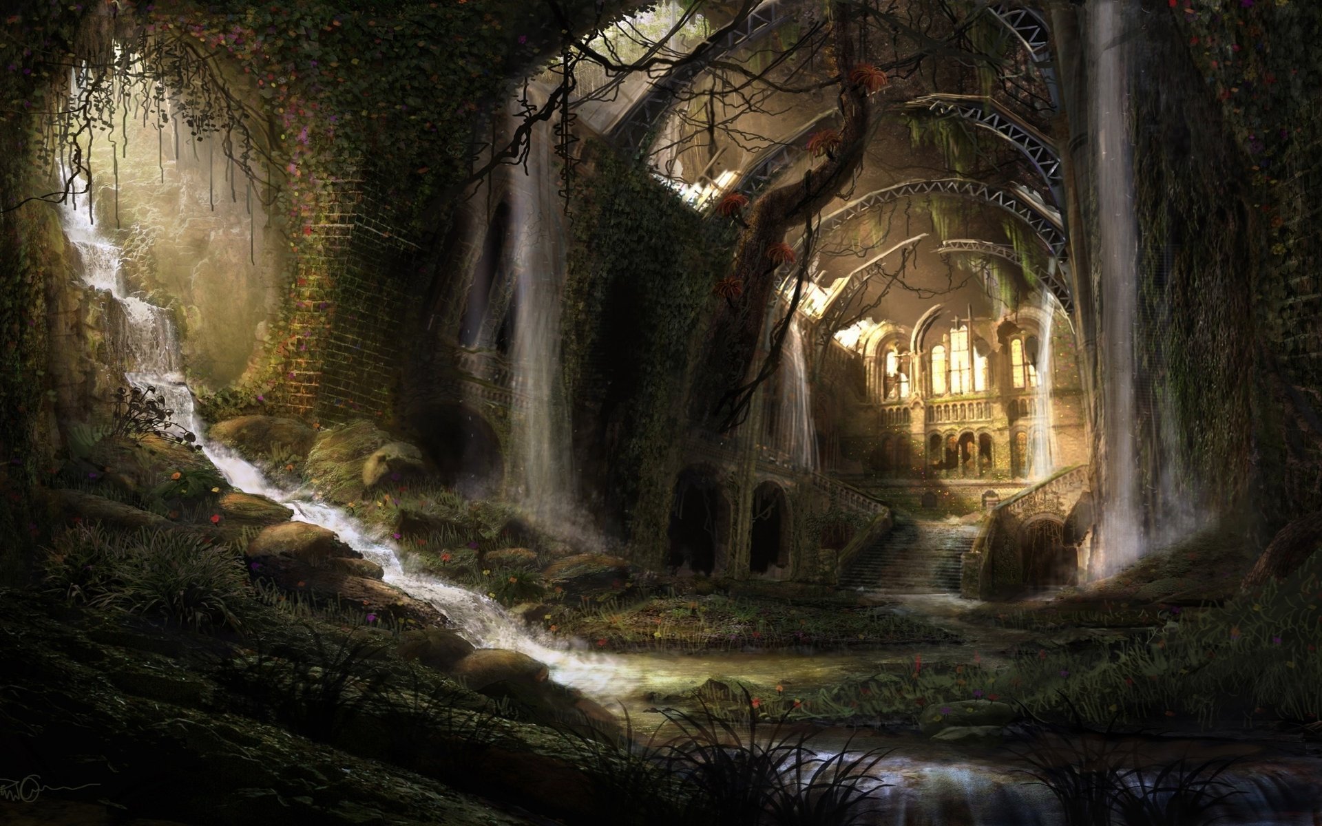 Mysterious ruins, a waterfall enliven a mysterious cave