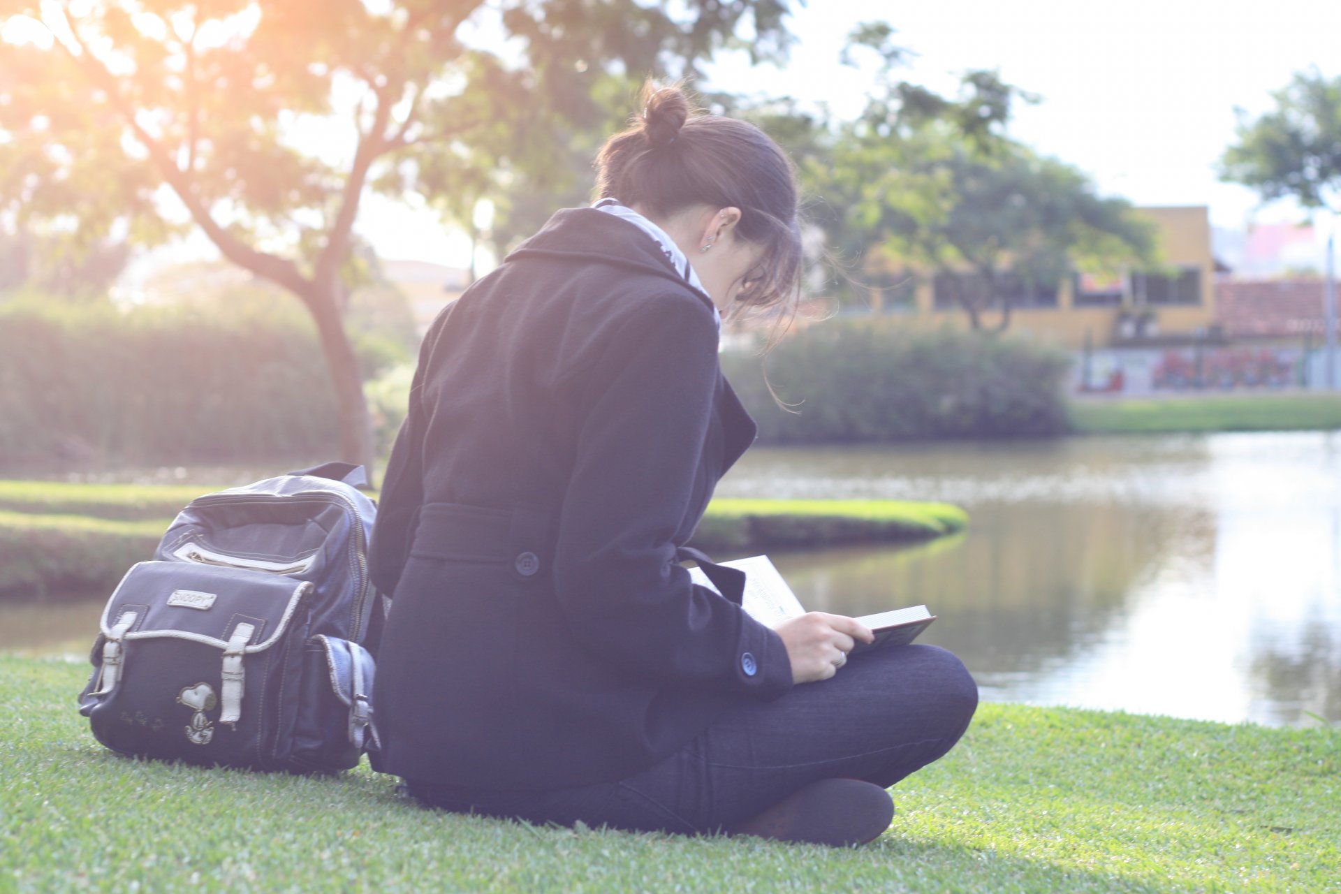 Image tags:nature, landscape, girl, brunette, sitting, land, grass, green, tree, foliage, leaves, spring, autumn, reads, book . textbook, interesting, coat, jeans, scarf, river, water, reflection, sun, rays, light, house, apartment, widescreen, full screen, hd wallpapers