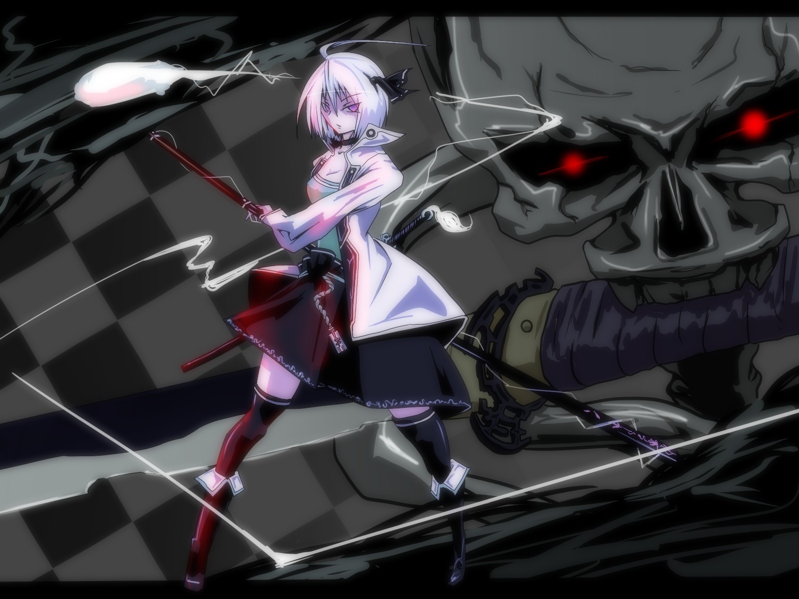 Image tags:necklace, short hair, enzo, red eyes, weapon, purple eyes, katana, konpaku youmu, sword, white hair