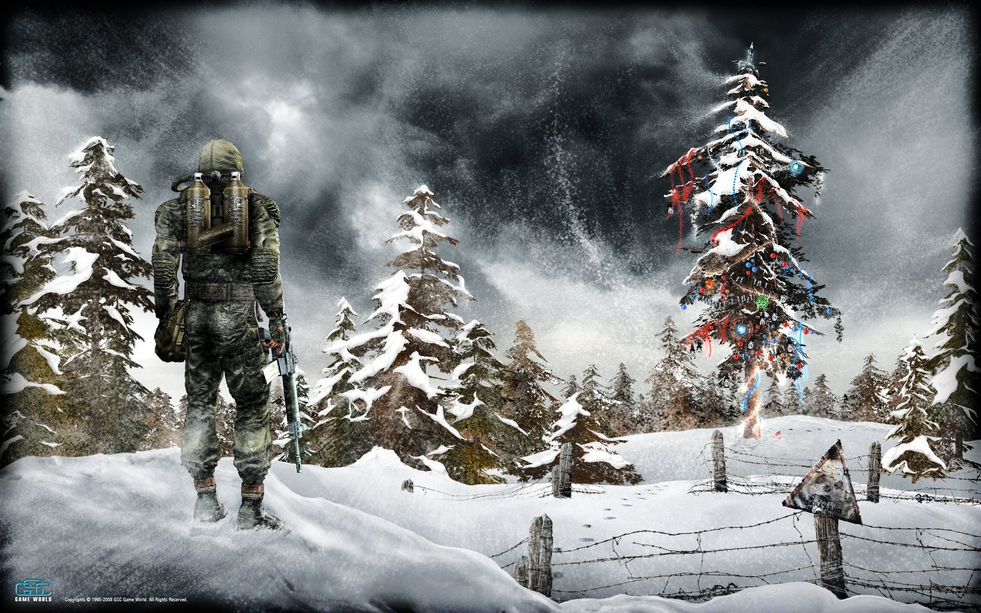 A man in combat gear with gas cylinders on his back and a machine gun in his hand looks at a Christmas tree in the world of the apocalypse