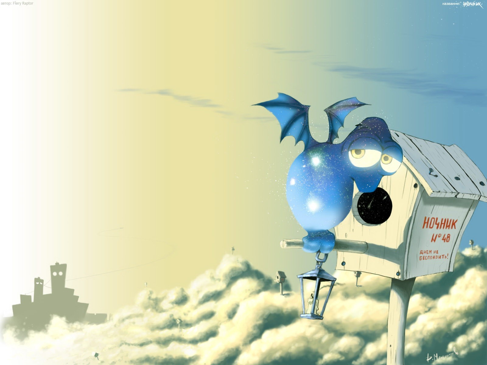 Blue sad dragon in the clouds