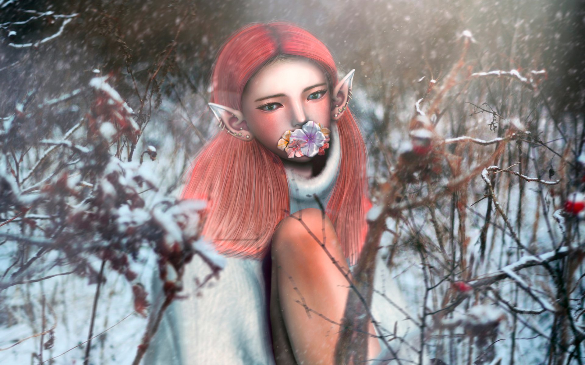 An elf girl is sitting in a winter forest