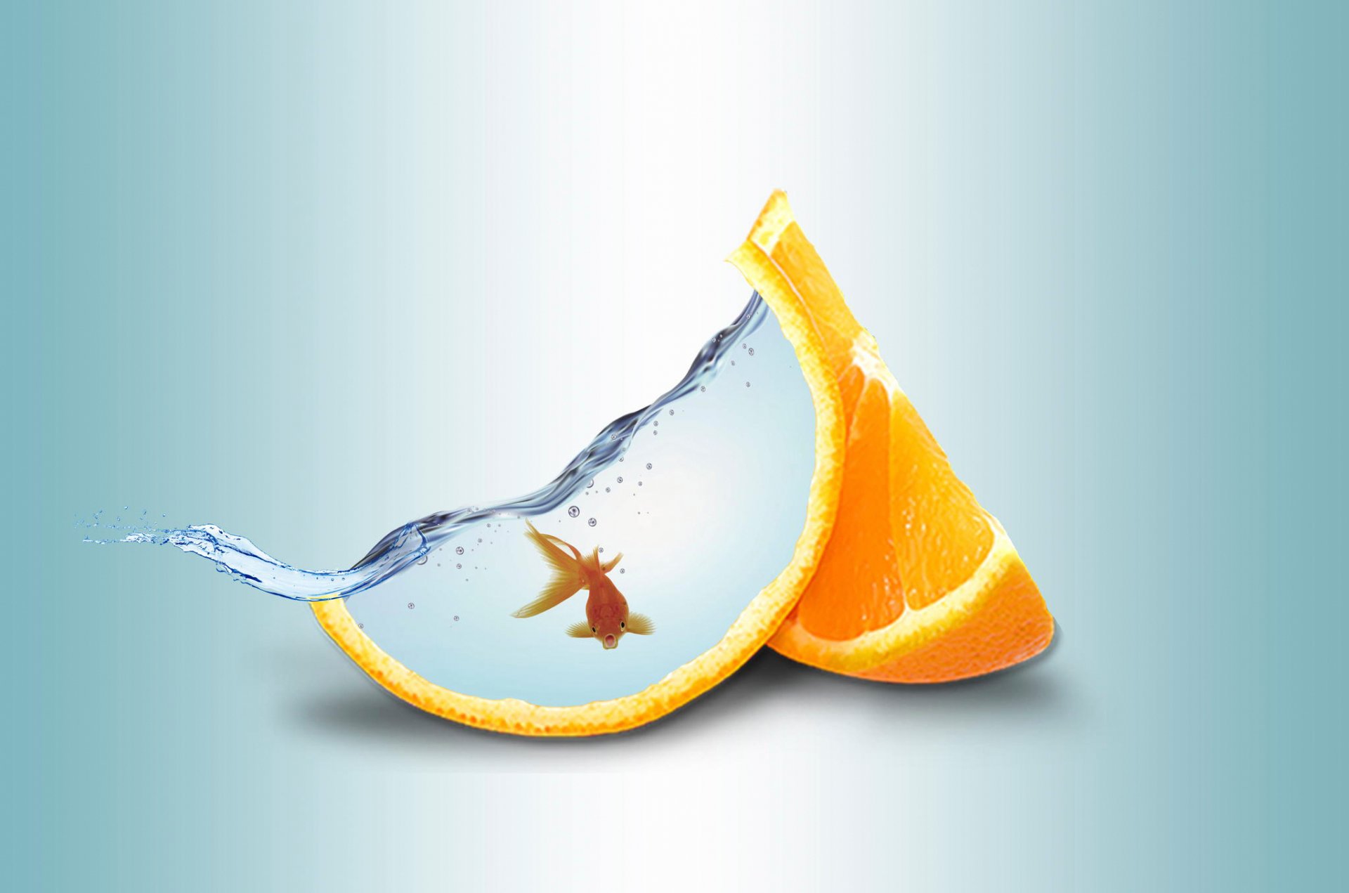 Two slices of orange with a goldfish in one of the slices