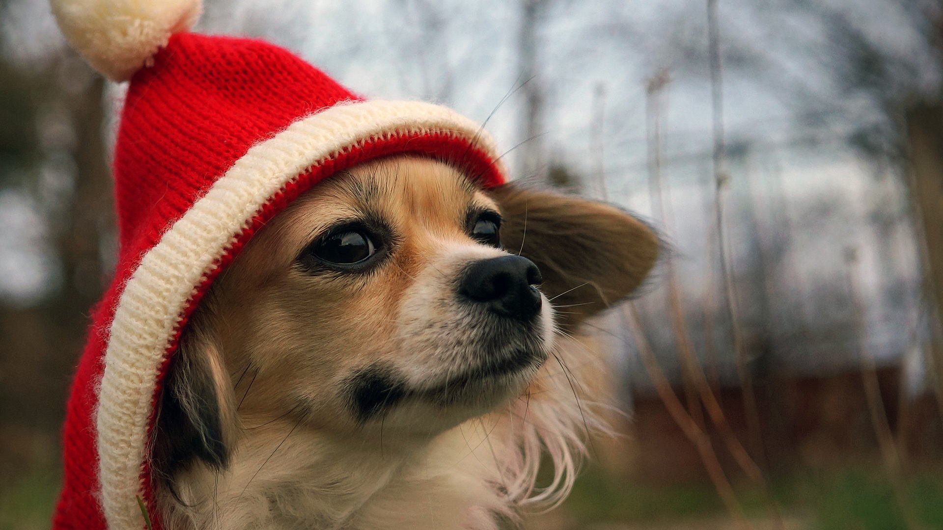 A red-haired little dog in a red and white hat with a pompom looks into the distance