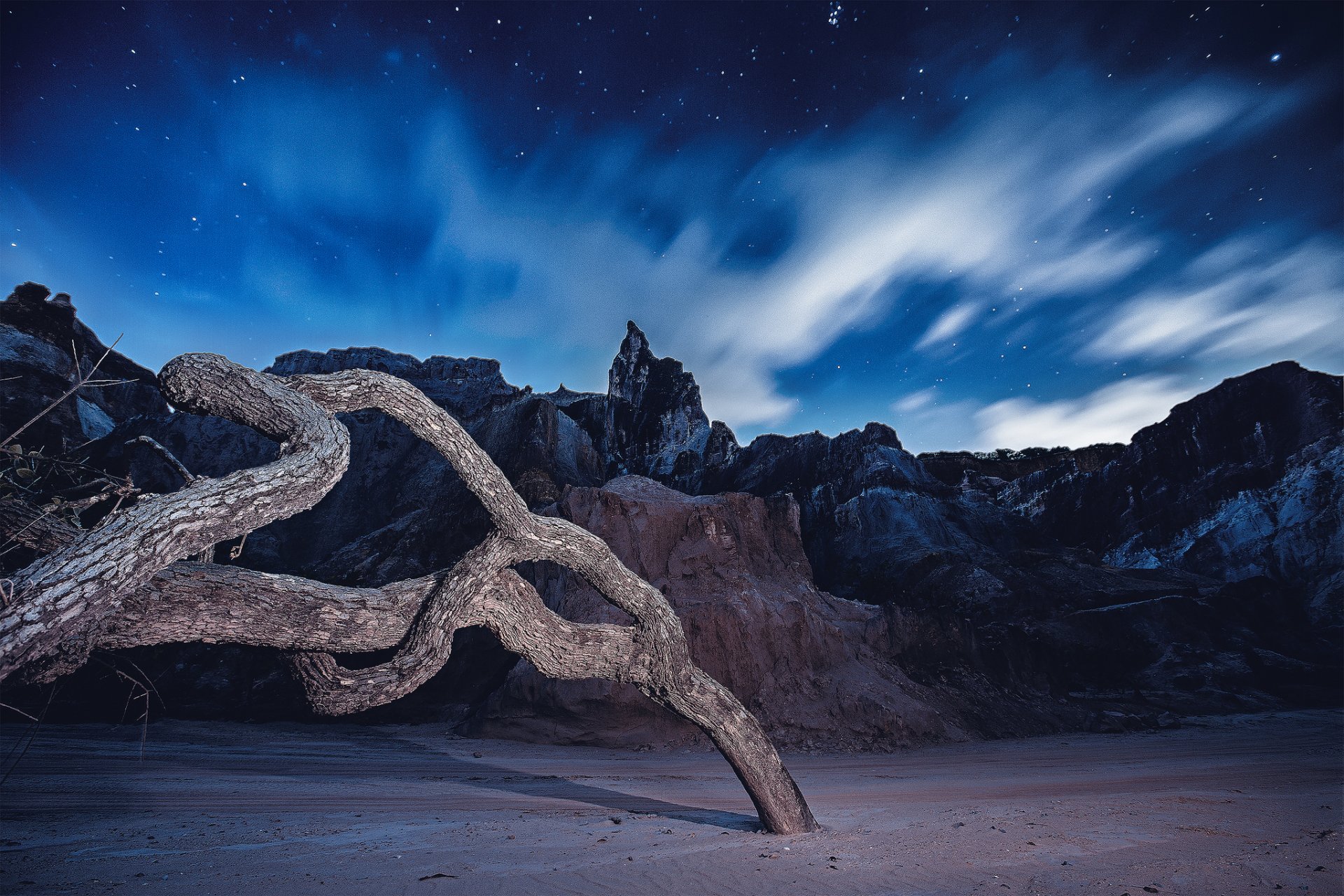 A bizarre snag on the background of rocks