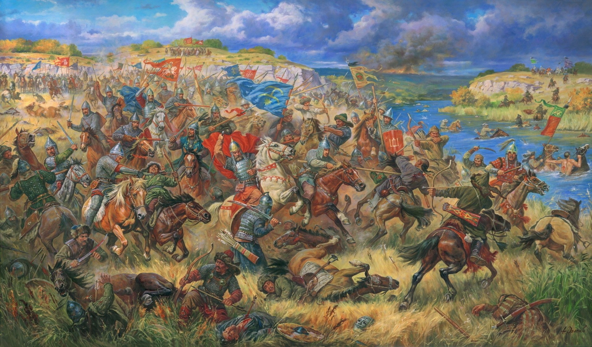 A painting depicting a battle on the river