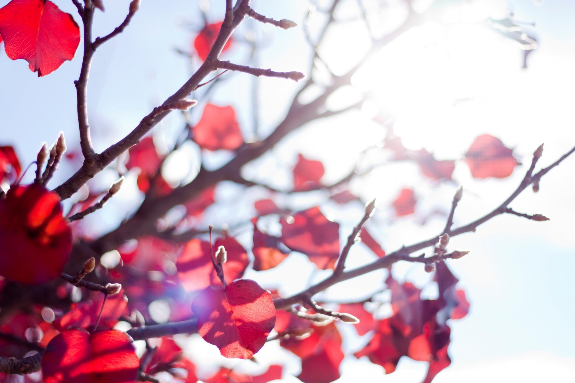 The red leaves of autumn. Sun rays on red leaves