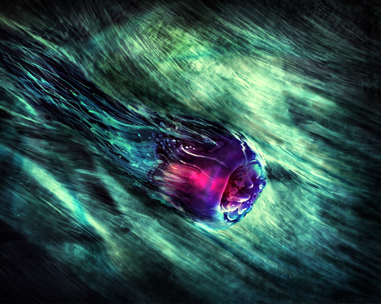 Lilac jellyfish on a green background