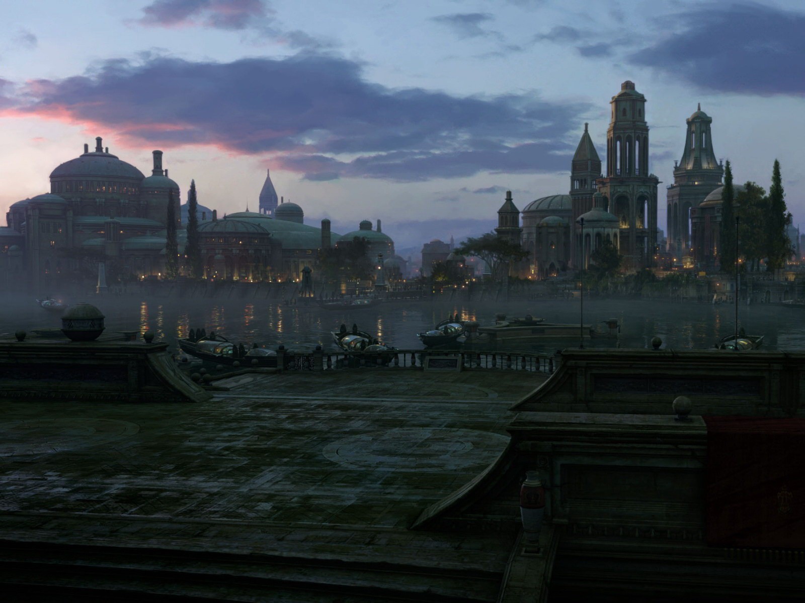 Evening in an ancient city on the shore of a reservoir