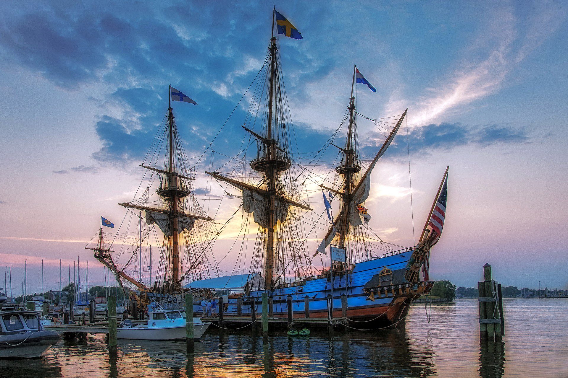 A ship with sails at a small pier