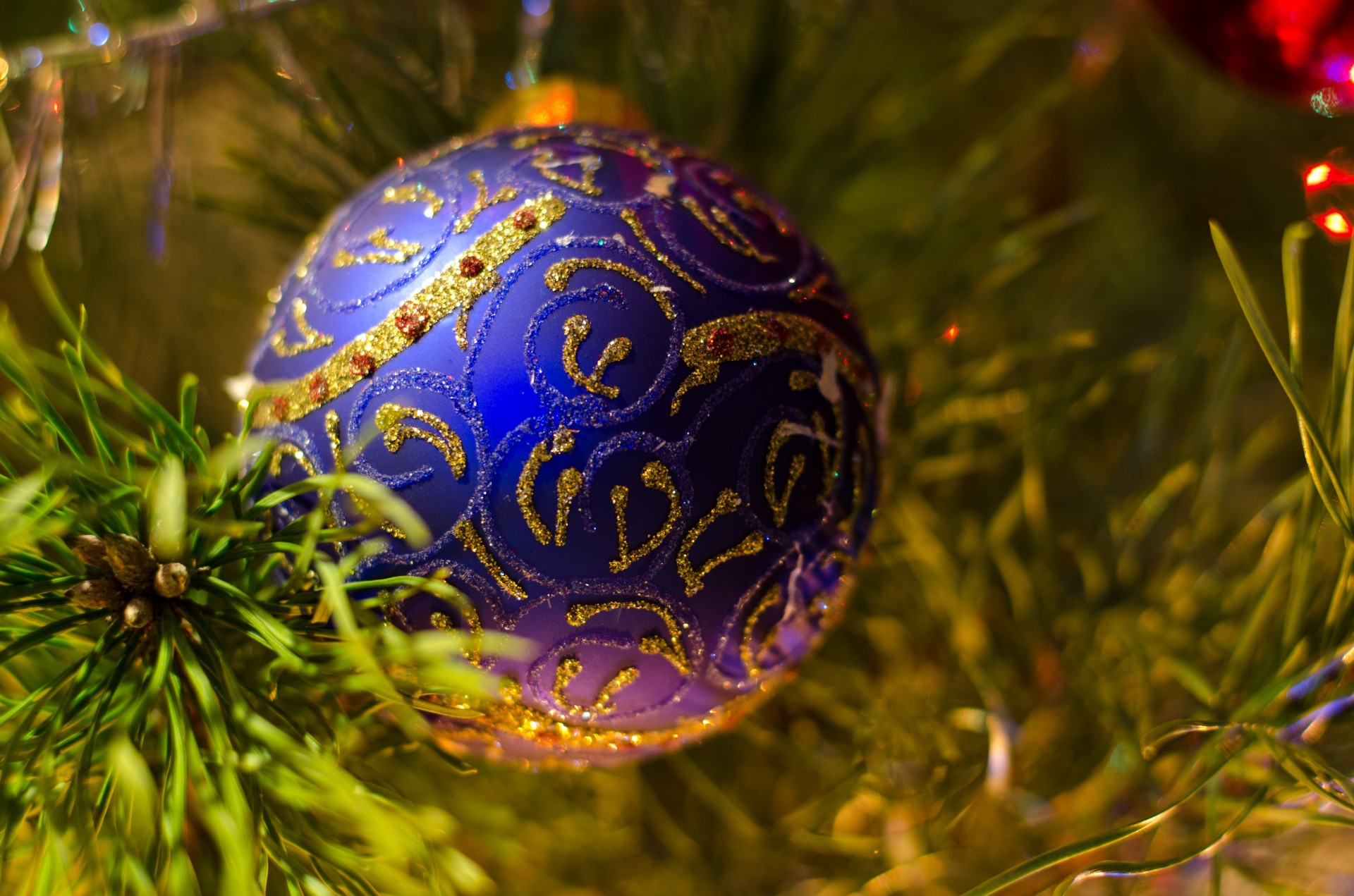 A blue Christmas tree toy with a golden pattern weighs on the Christmas tree