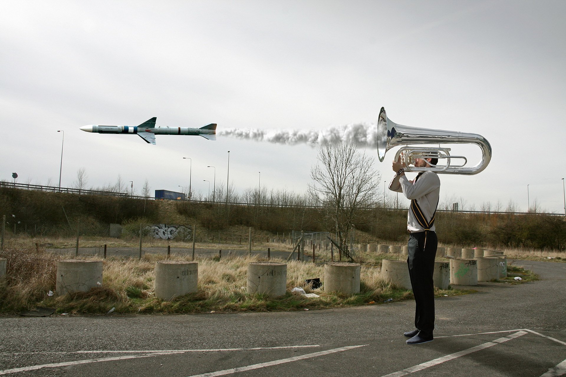 The guy blows into the pipe from which the rocket flies out