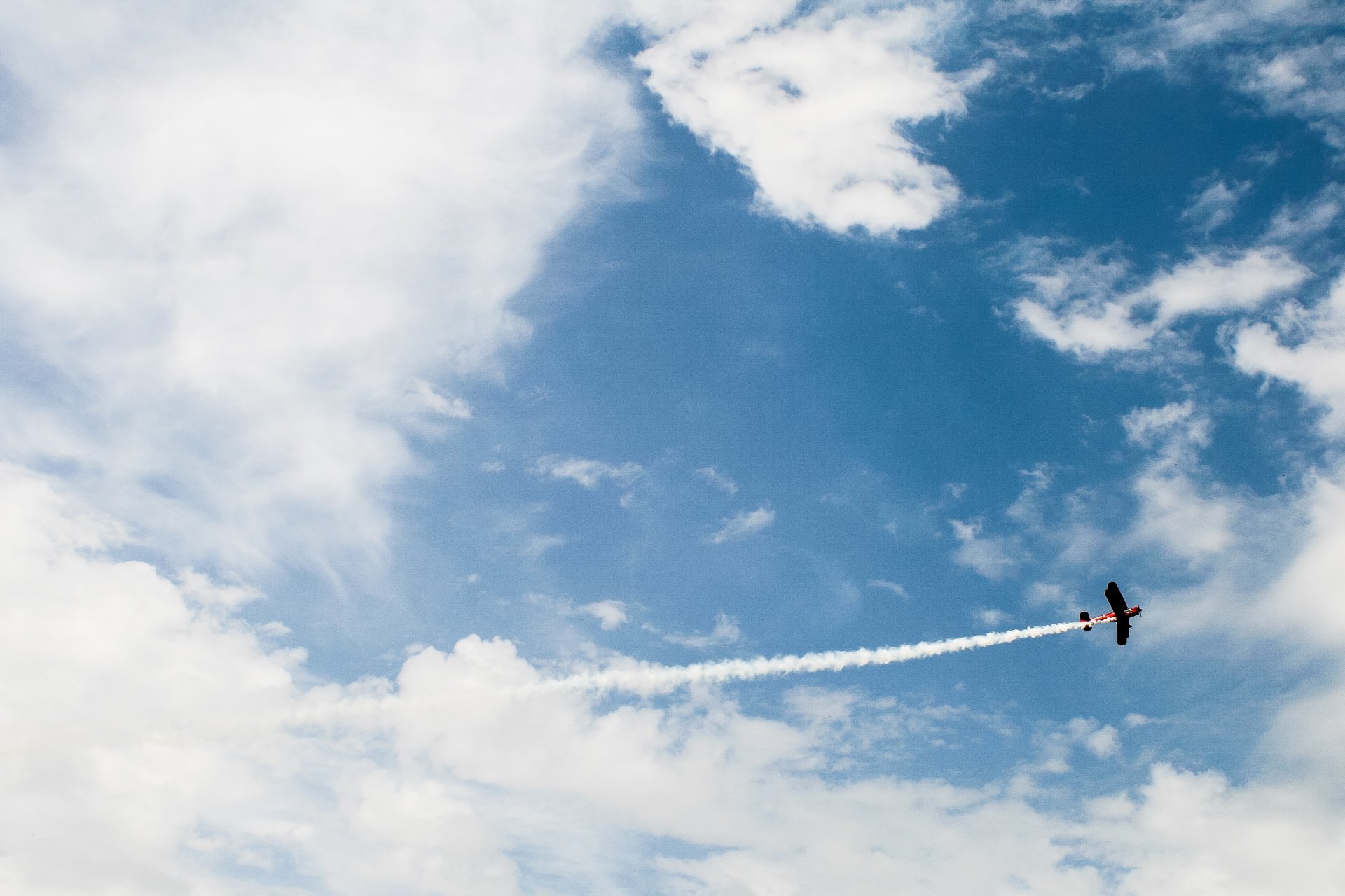 In obloki, a cornfruit plane flies and leaves a trail behind it